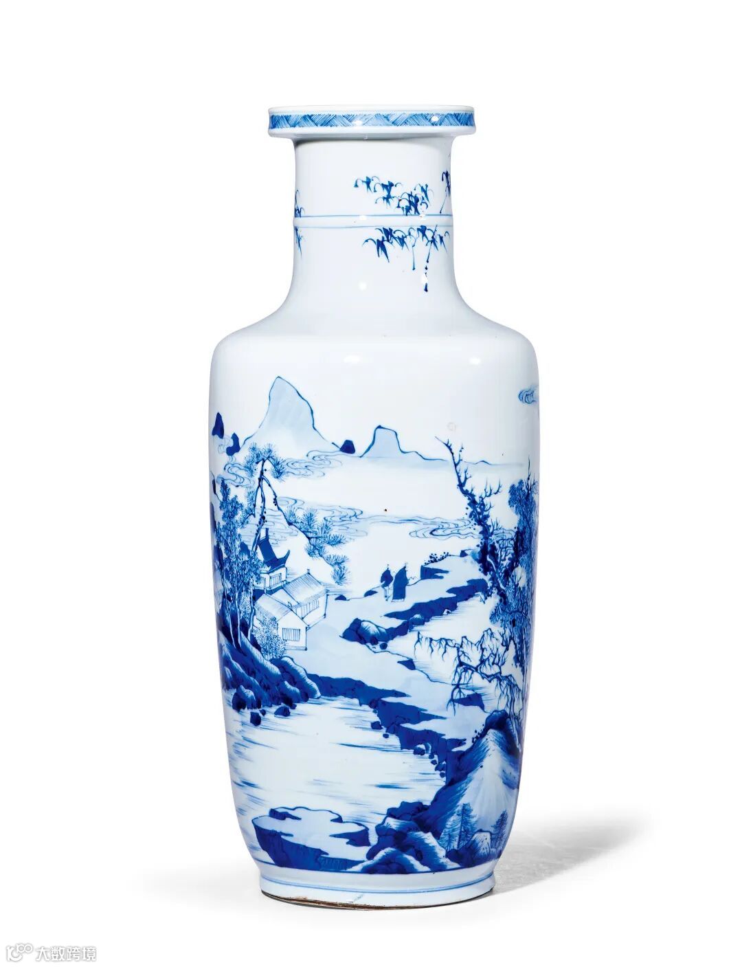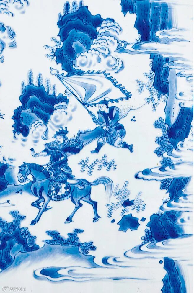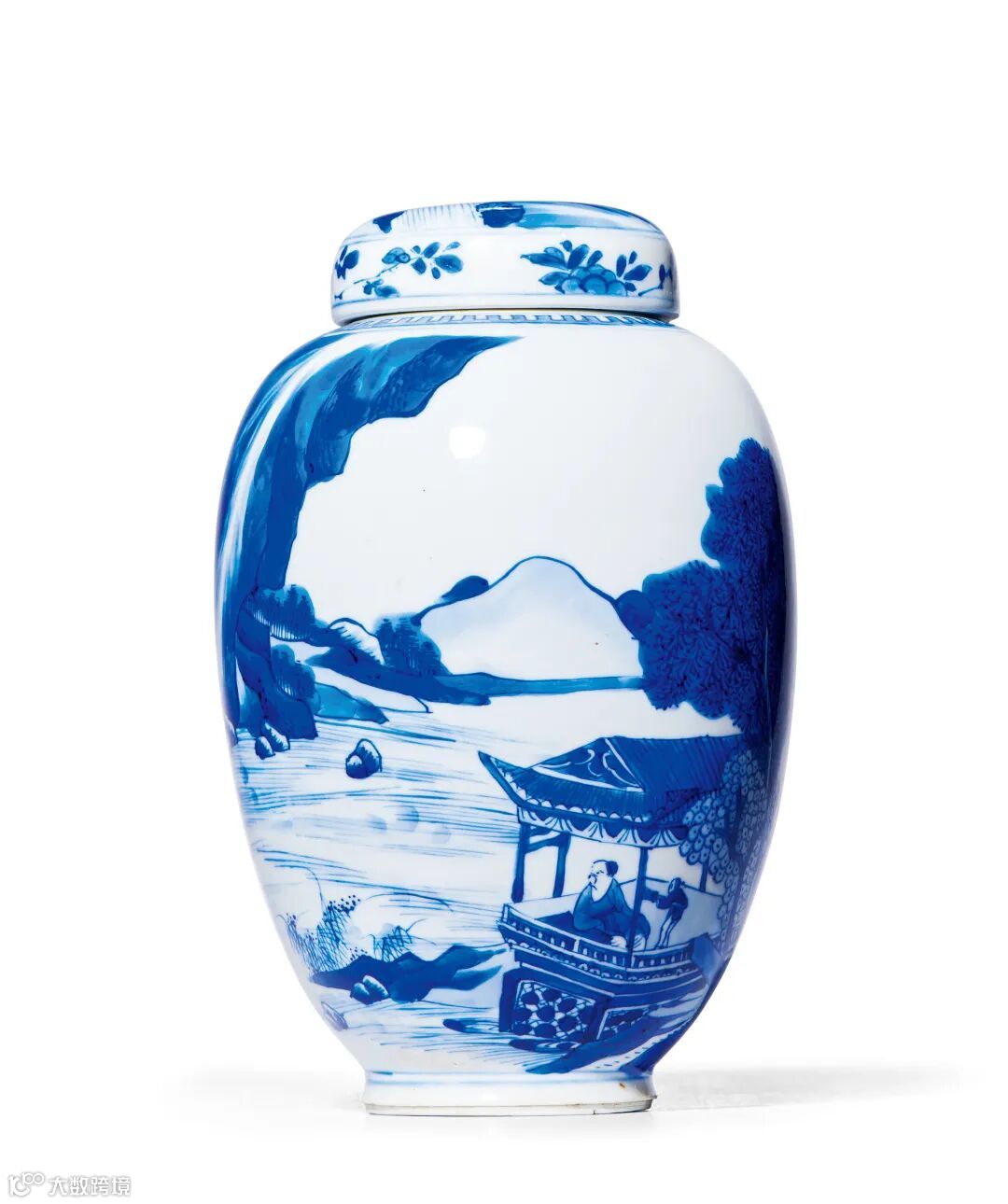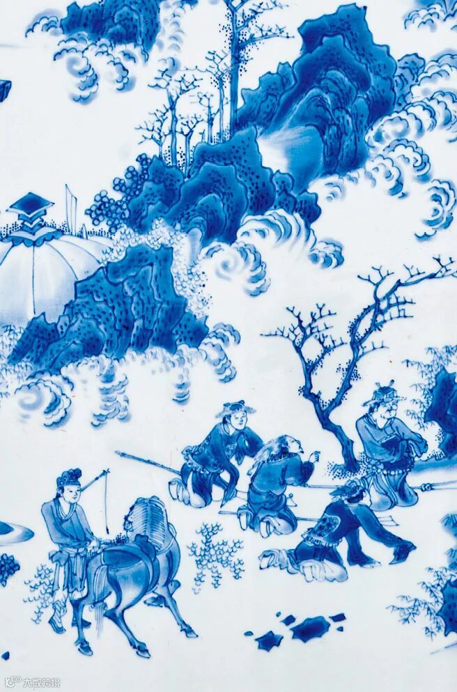 康熙时期,景德镇制瓷工匠纯熟地掌握了珠明料的呈色技术,烧出了被誉为“翠毛蓝”、“宝石蓝”的康熙青花,这种多色阶青花层次分明,故又有“五彩青花”之称,是青花器制作史上的重要创新。最能代表康熙青花艺术风格的即是以山水、人物为主题的瓷绘题材。康熙青花瓷中的山水画面表现了一种情景交融、澄怀观道的艺术理想境界,展示的是简淡、玄远的意味,以大自然的山川草木、云烟明晦为创作源泉,赋予瓷器本身以灵感,山水成了创作者书写情思的媒介,所以中国画和诗,也包括陶瓷艺术,都爱以山水境界作表现和咏味的中心,意欲将人生境界和艺术境界融为一体,表现出中国封建社会后期文人画所追求的思想情趣和审美趋向。