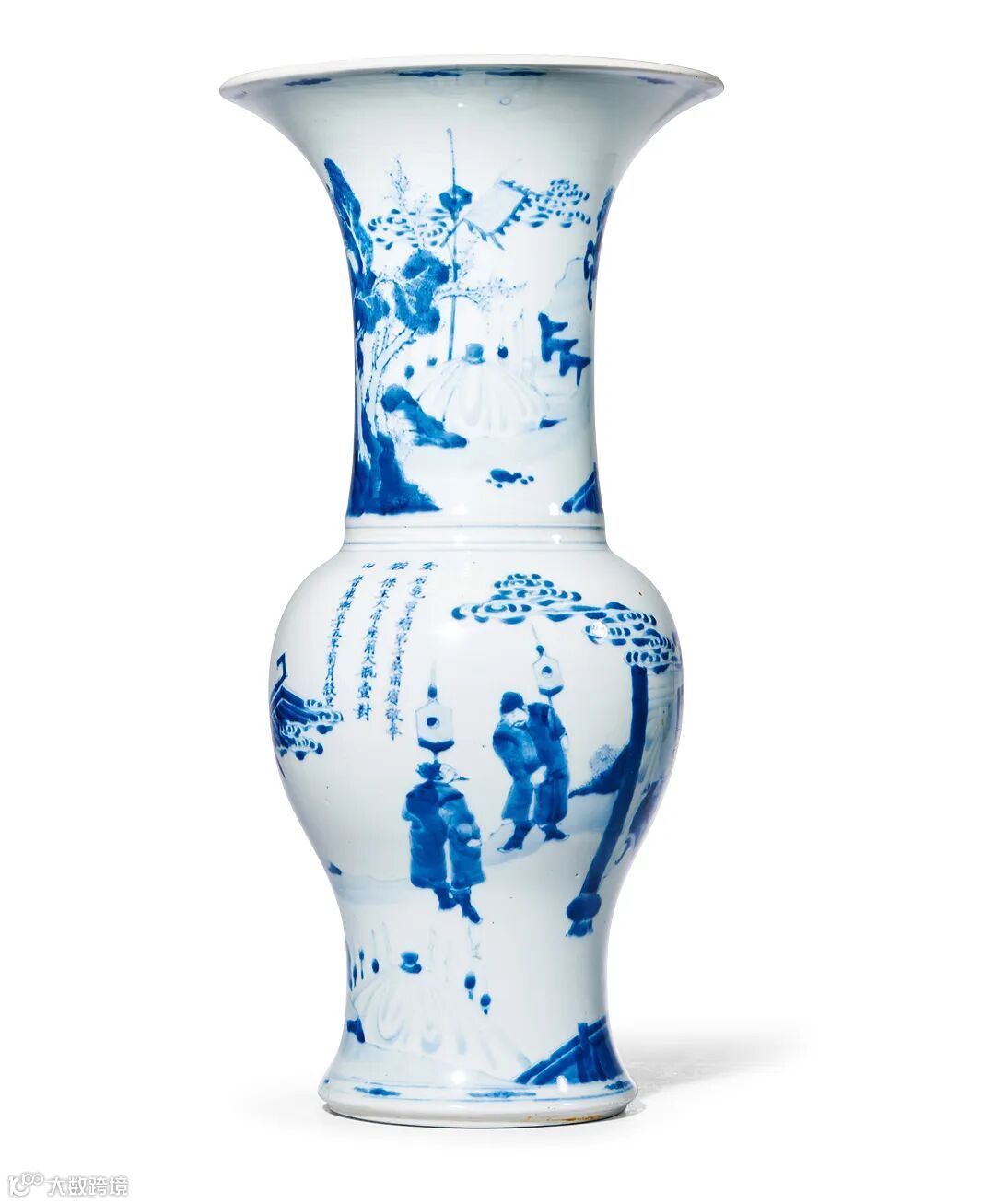 康熙一朝所烧青花最为精美,康熙青花风尾尊、康熙青花观音尊、棒槌瓶、马蹄尊等都是康熙朝独有的器型。而其中康熙青花风尾尊,其风格雍容华贵,娇艳富丽,高贵典雅,气度不凡,可称康熙青花扛鼎之作。