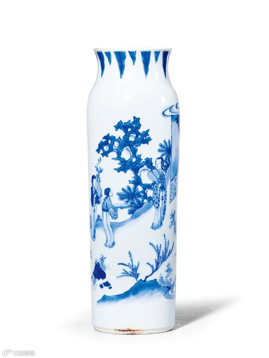 筒瓶是崇祯时期的典型器形,此件筒瓶唇口束颈、直腹下敛、底足平实,呈直筒形,造型挺拔,为这一时期的标准形制。晚明时期时局动荡,此种造型也寓有“天下一统”的良好祝愿。LOT20 明崇祯 青花「拜月图」小筒瓶此件筒瓶尺寸较小,造型端庄秀挺,胎骨厚重坚致,釉汁滋润明亮,时代特征鲜明。