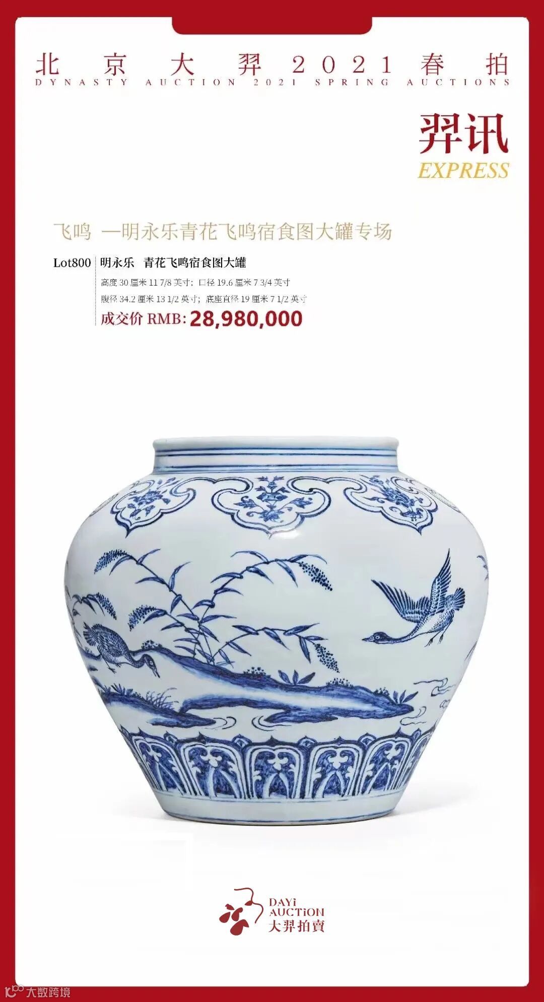 在不平凡的2021年,北京大羿拍卖面对市场的风云变幻,坚守初心,深耕细作,在春拍中取得了总成交1.33亿元的好成绩,其中“龙焱:重要御窑瓷器”专场和“飞鸣:明永乐青花飞鸣宿食图大罐”专场表现最为突出,斩获了94,840,500元,从中可以清晰地看到北京大羿不懈地挖掘和专业性的学术梳理,为拍品发掘了新的亮点,对市场发挥了积极的引导作用。同时也感谢广大藏家的信任与支持,我们将步履不停,再度出发,全面向各位藏家朋友征集御窑佳器,期待与您再度携手,共创美好的未来。