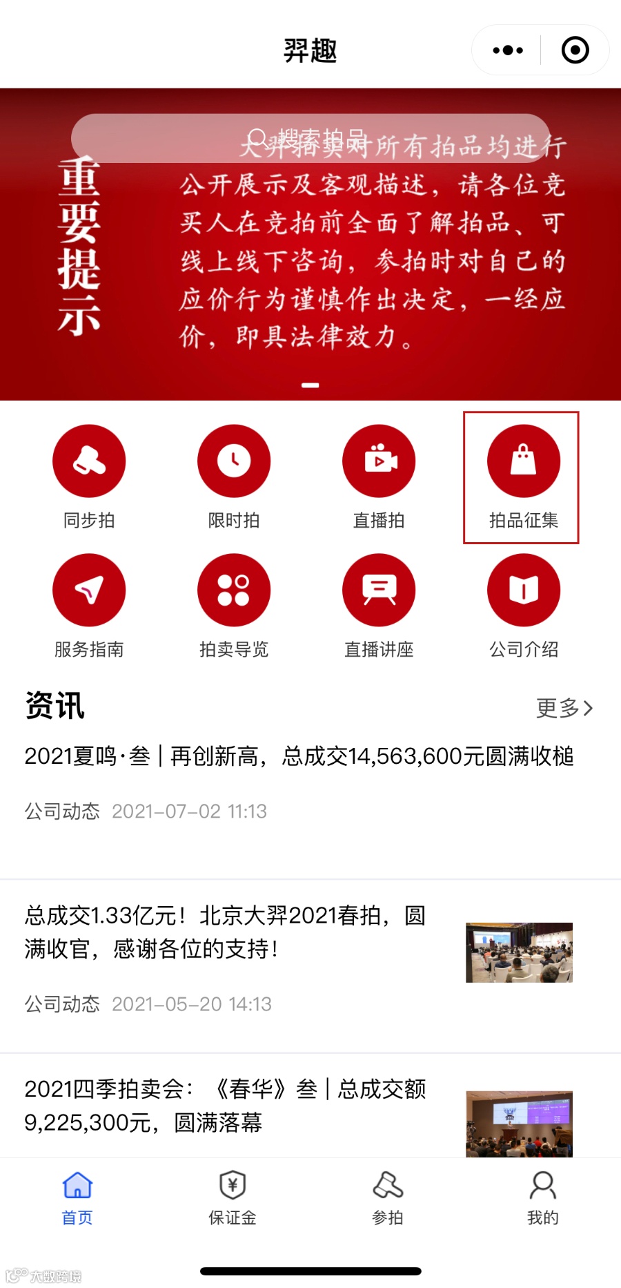 2. 您亦可进入微信小程序【羿趣】首页,点击【拍品征集】,填写信息详情和并上传高清大图。我们的业务部门专家会定期审核投稿,如您的藏品适合上拍,我们将会与您联系。