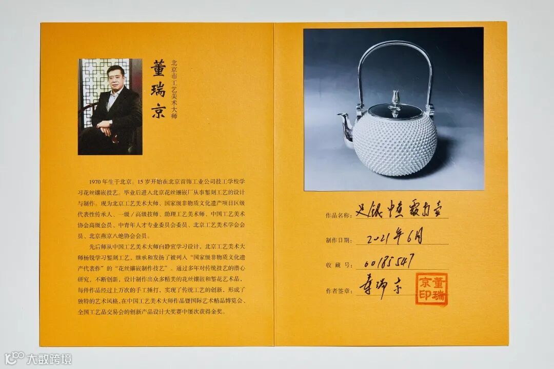 董瑞京先生是北京燕京八绝之花丝镶嵌枝艺传承。师从中国工艺美术大师白静宜学习设计,师从北京市工艺美术大师杨锐学习錾刻工艺,继承和发扬了被列入“国家级非物质文化遗产代表作”的“花丝镶嵌制作技艺”。
