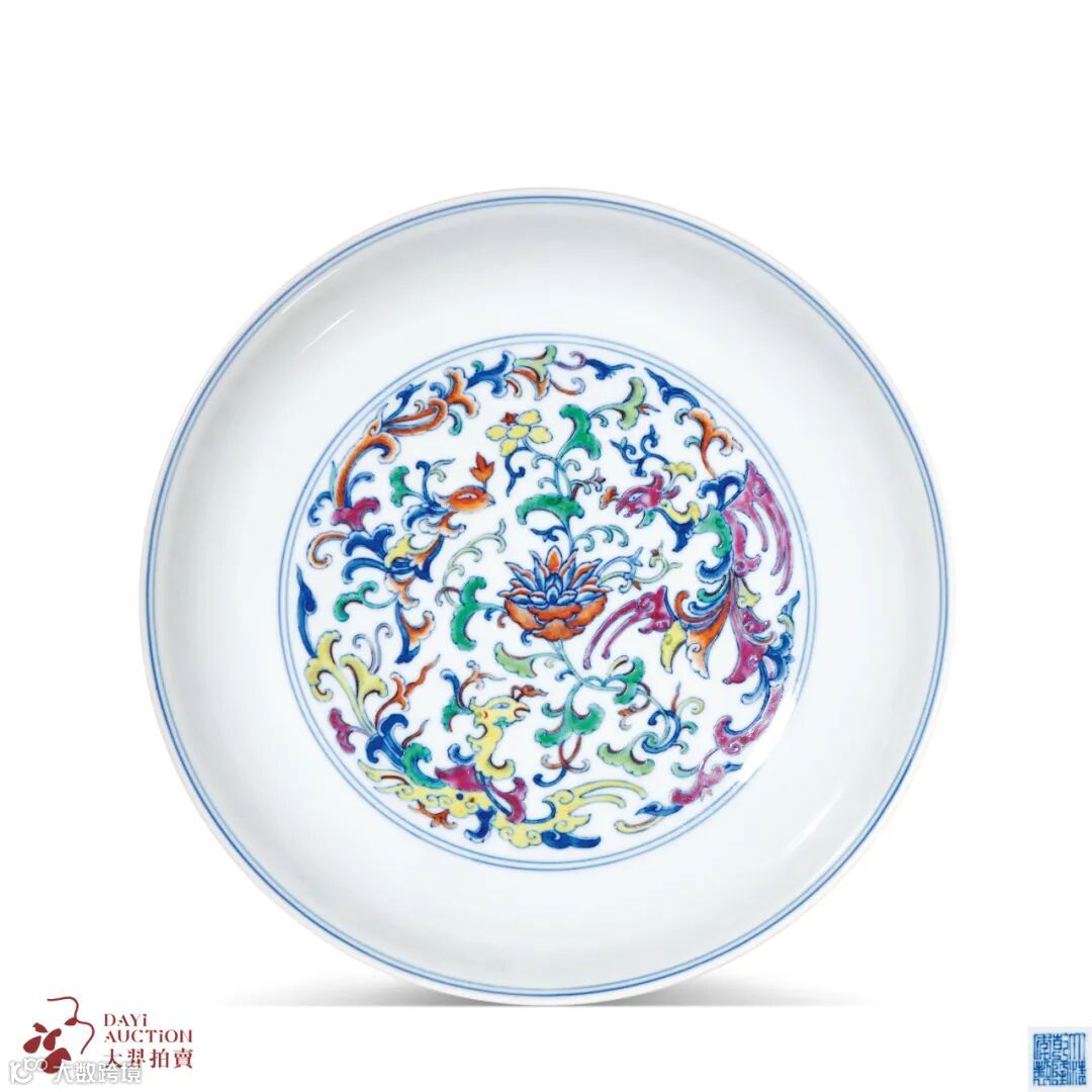 此盘以夔凤为题材,昭示着乾隆朝之盛。器身通体施白釉,釉面光洁亮润。盘壁近口处有青花弦纹,外壁以斗彩绘四组夔凤,间以折枝花卉相隔,夔凤飞舞于繁花之间,轻盈艳丽。