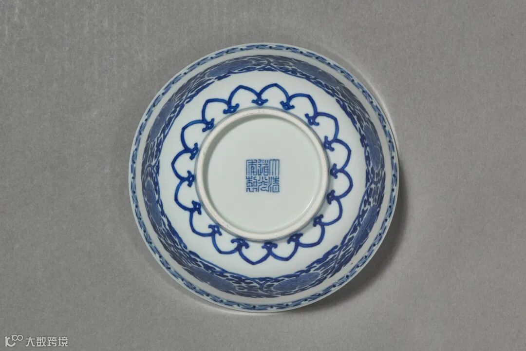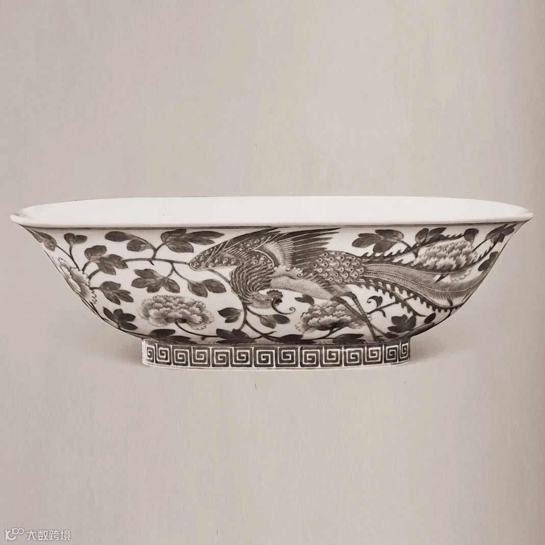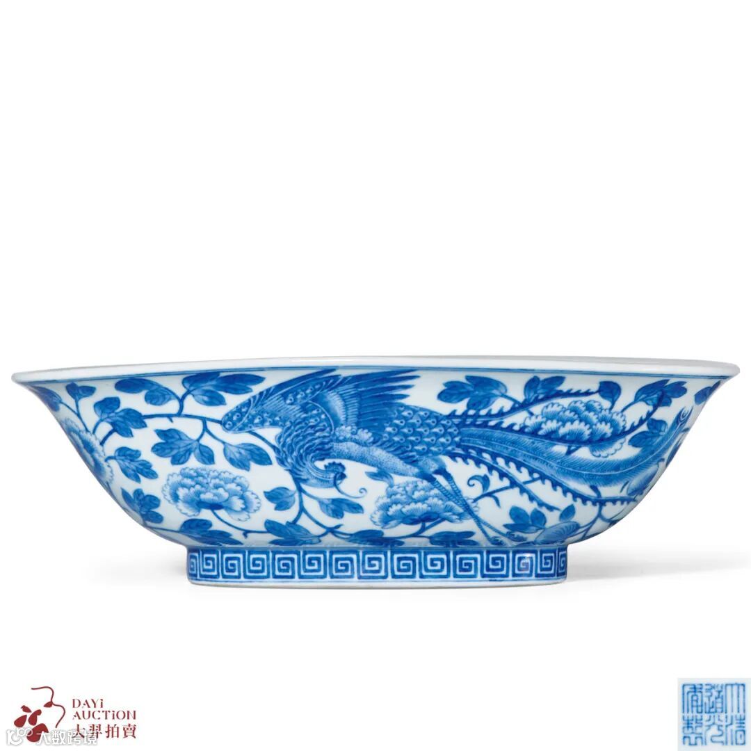 此承盘呈椭圆形,撇口,弧腹,圈足。外壁以青花绘凤穿花纹,足墙外饰一周回纹,底书“大清道光年制”六字三行篆书款。二凤一前一后,追逐嬉戏于繁茂的牡丹花丛中。凤造型华贵,昂首回头间均傲气十足,描画甚为精细,翎毛羽翼皆不惜逐一刻绘。牡丹亦姿态娇艳,花枝宛转自若,风范尽显。