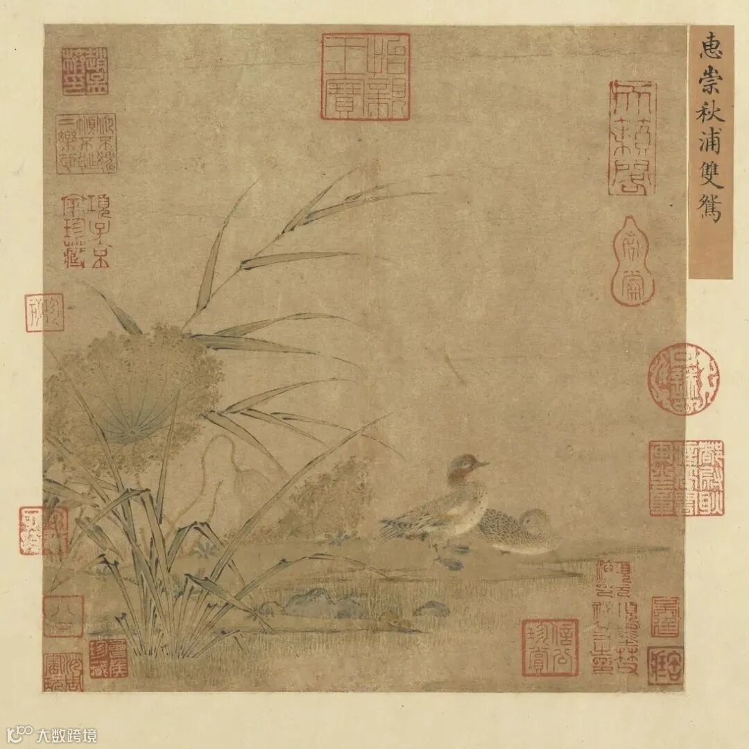 荷塘鸳鸯常见于明清瓷器和书画之上,取琴瑟和鸣,连生贵子之意。这个如斯恩爱的纹饰,早在赵宋之初便开始流行,台北故宫珍藏《秋浦双鸳》,出自北宋画僧惠崇之手,便是存世其中一个最早之例。