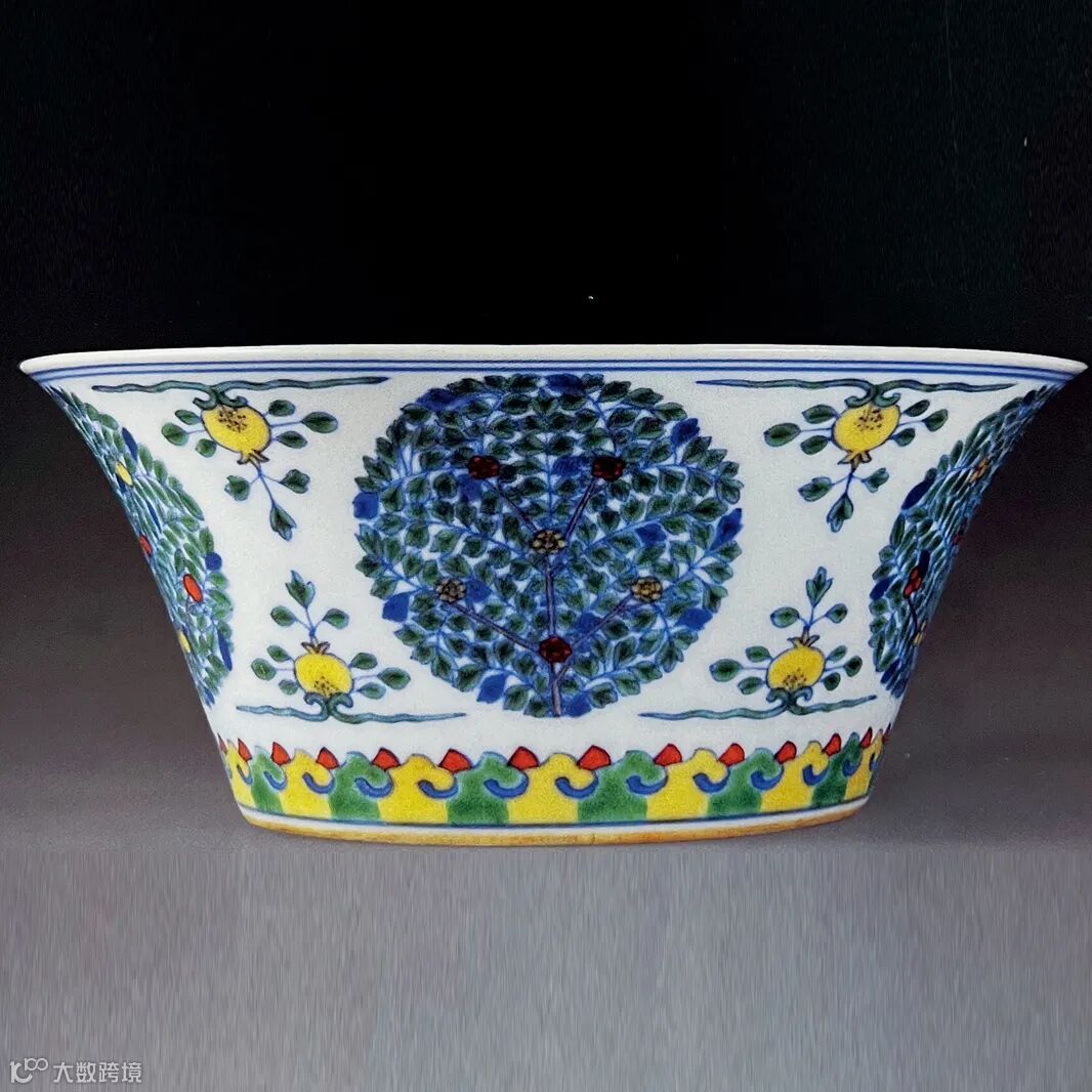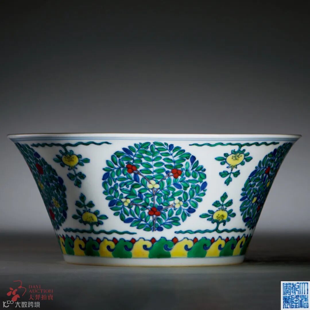 拍品撇口深腹,内挖浅圈足,形如倒置马蹄,故名。碗胎体轻薄,釉汁滋润,纹饰以斗彩工艺绘制而成,外壁主体以蓝、红、绿、黄四色彩环绘团花五朵,其间点缀折枝石榴,近足处则装饰变体如意纹,整器纹饰布局得当,填彩精细,釉下青花与釉上诸彩上下相映,左右争妍。