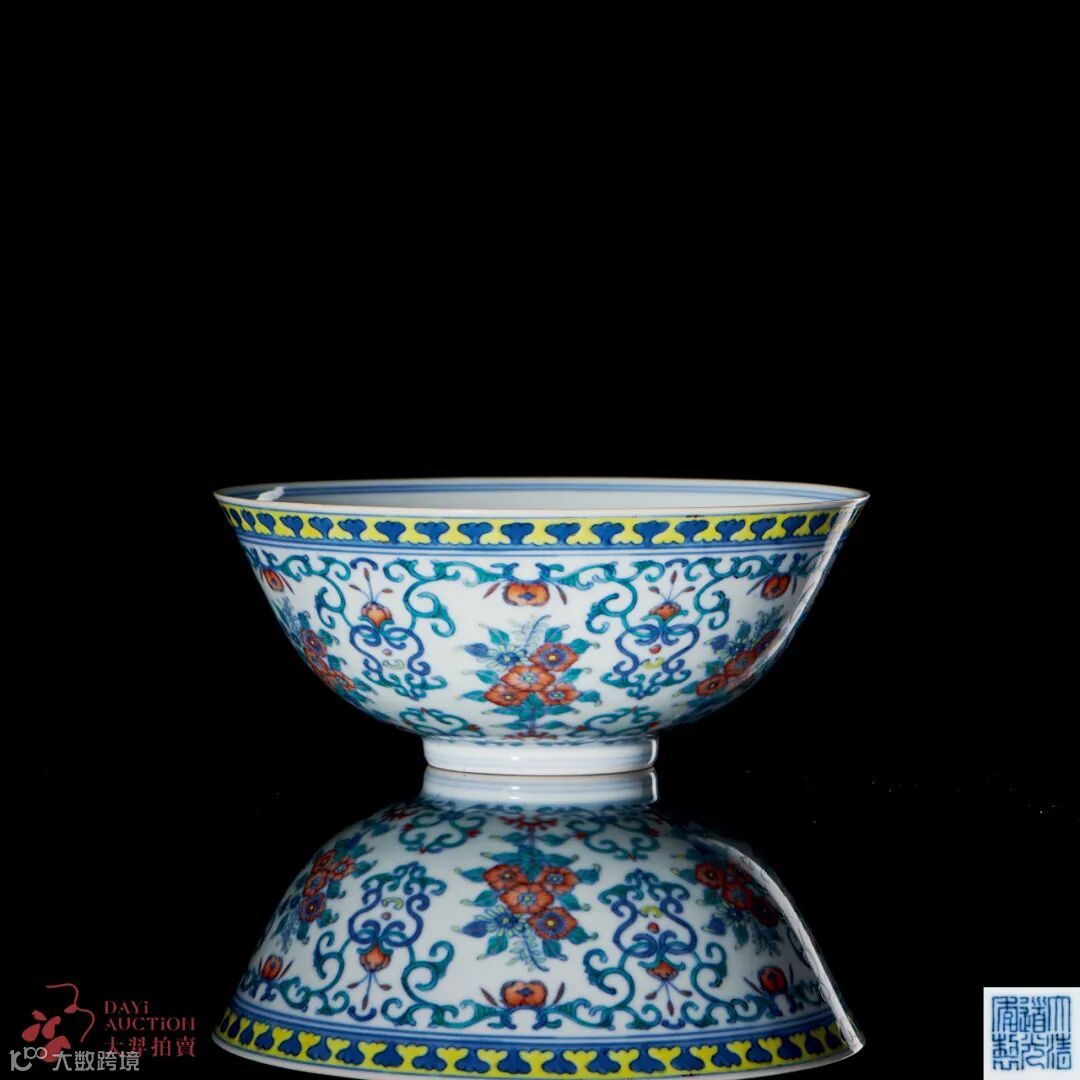 拍品撇口,弧腹,圈足。碗内外壁均为构图烦琐、色彩丰富的花卉图案纹饰,口边沿为如意间花卉纹,纹饰汲取借鉴西洋因素,尤以当时欧洲流行的洛可可风格最具特点,引领了官窑器装饰的新风尚。