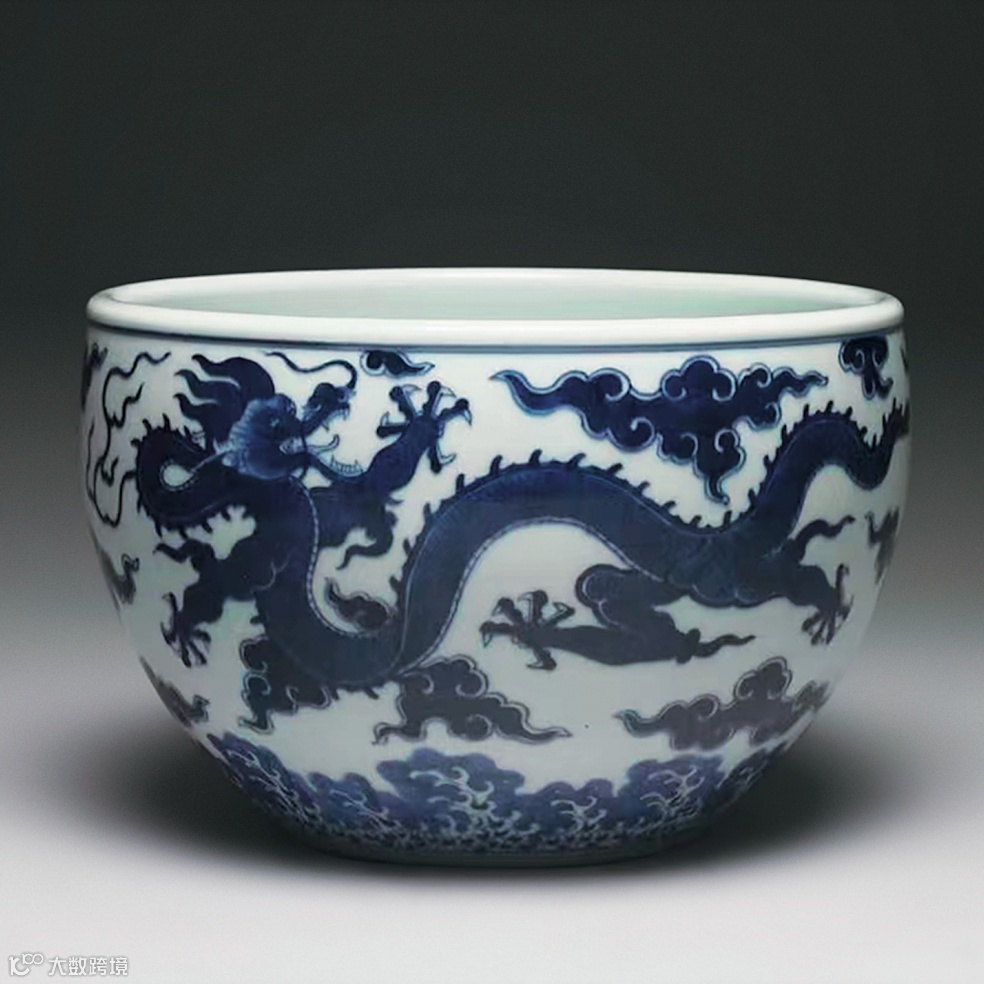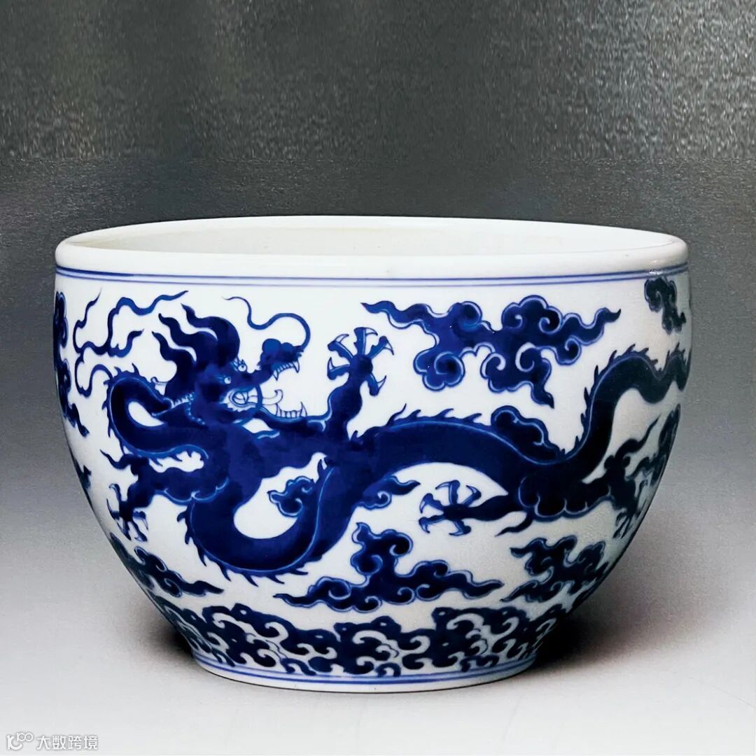 《乾隆三年内务府造办处活计档·江西》记载,“(乾隆三年)六月二十五日:七品首领萨木哈、催总白世秀来说太监高玉交……嘉窑青龙小缸一件……,交与烧造瓷器处唐英,具照样烧造送来。烧造完时再将原磁器缴回,仍交磁器库。此磁器内有大器皿应画样带去,其小磁器皿具各带。钦此。” 由此可知,此式青花云龙纹缸为乾隆钦定仿烧。