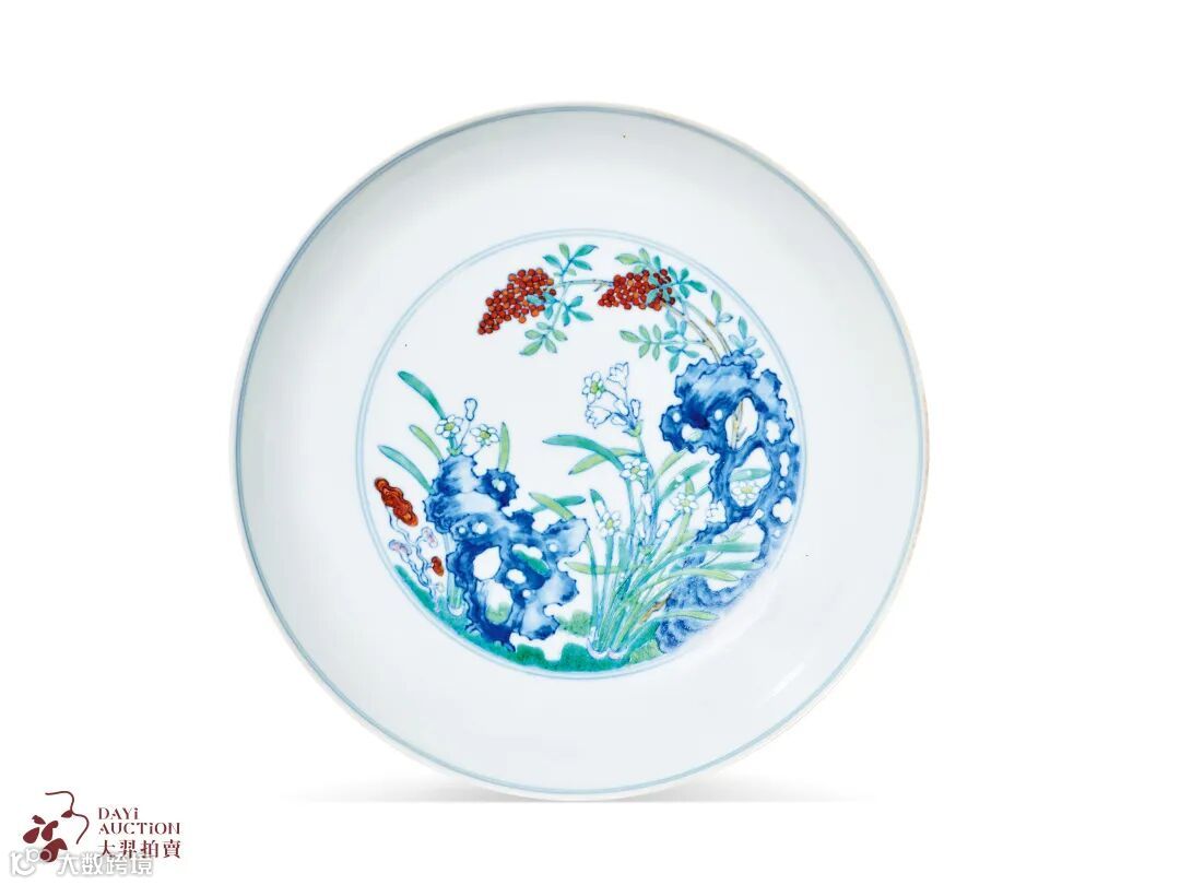 本品造型俊雅端庄,通体白釉匀洁如玉,外壁及盘心皆绘以斗彩灵仙祝寿图,画意清秀细腻,设色淡雅逸丽。画中洞石骨瘦嶙峋,水仙花丛掩映其中,上有天竺横欹而出,旁有灵芝倚石而生。灵芝、水仙与天竺,取其谐音有“灵仙祝寿”之意,寓意吉庆福寿、玉堂富贵。雍正御窑斗彩瓷器名贵品种,雍正帝对此种纹样颇为珍视,从北京故宫博物院藏《胤禛行乐图·书斋写经页》中可见端倪。