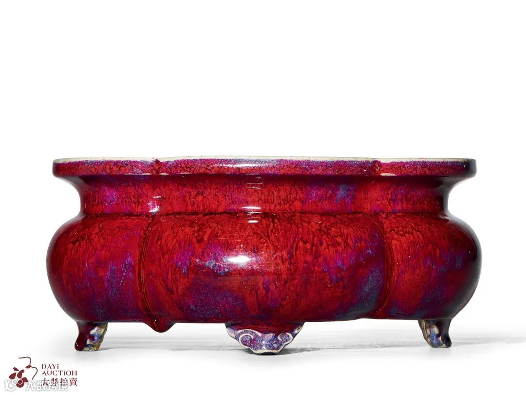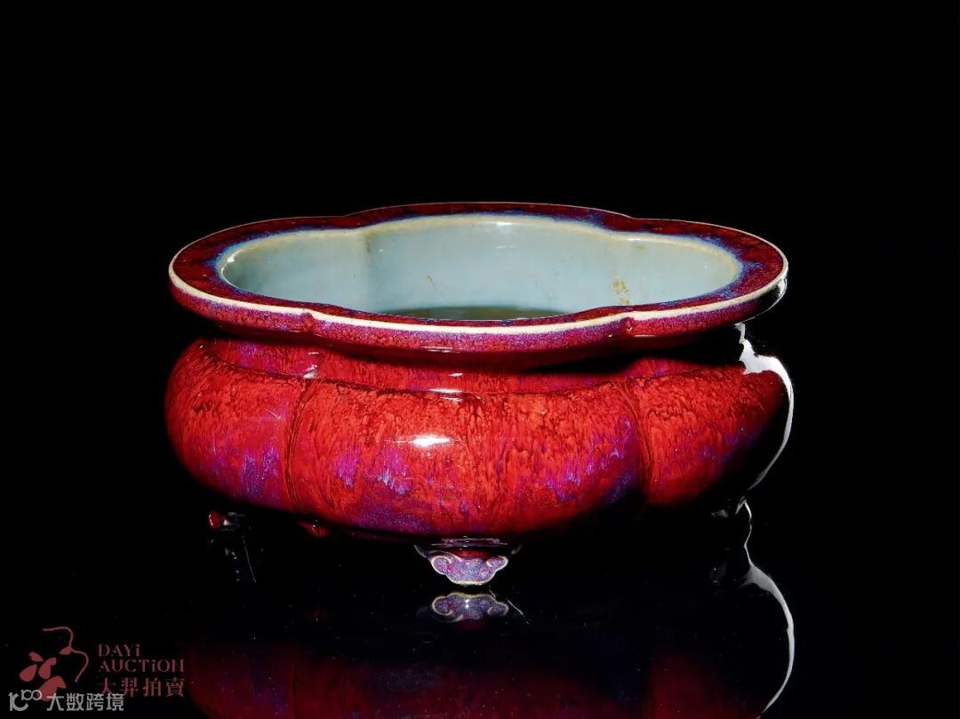 窑变釉是一种以铜红釉为主,并添加多种金属元素烧制而成的高温釉,其釉汁流淌看似天成,实际其呈色规律已为当时窑工所掌握,从而塑造出艳丽华美的釉色。清蓝浦《景德镇陶录》赞有:“窑变之器有二,一为天工,一为人巧,其为天工者,火性幻化,天然而成……其由,则工,故以泑作幻色,物态直名窑变。”由此,窑变釉器从造型、装饰到釉色各方面获得可控的突破,渐趋完美。本器造型优雅,釉汁流淌自然,釉色瑰奇,与为乾隆朝窑变之典型器物。