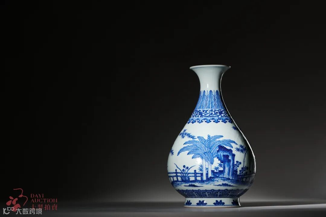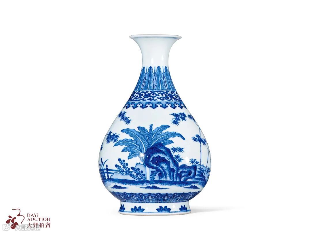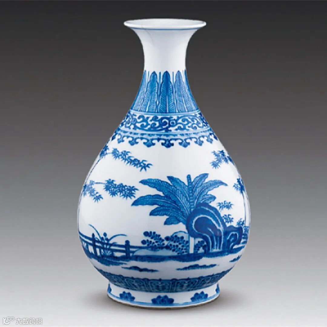 玉壶春瓶是宋代创制的一种瓶式,由宋人诗句中“玉壶先春”一词而得名。玉壶春瓶富有诗意,愈增声华。如王昌龄《芙蓉楼送辛渐》“洛阳亲友如相问,一片冰心在玉壶”,宋苏轼《宝山新开径》“回观佛国青螺髻,踏遍仙人碧玉壶”等。玉壶春瓶装饰竹石芭蕉图,最早见于明代洪武御窑,有青花、釉里红制品。永宣时期制品最美,清代康熙始仿明初之作,乾隆朝烧造达到极致。以后历代官窑均以乾隆竹石芭蕉纹玉壶春瓶为标准范式,一直延烧至清末,以青花居多。