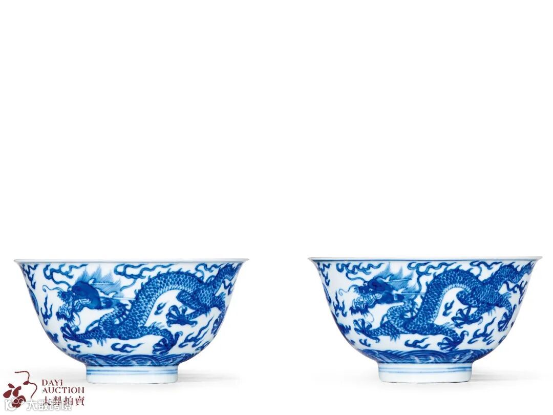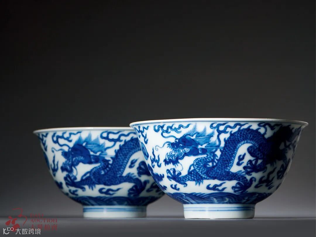 此对拍品撇口,弧腹,下承圈足,胎体坚致。通体施白釉,外壁以青花装饰,胫部绘海水山崖,上方通景绘双龙赶珠,二龙牙尖爪利,怒目圆睁,形体矫健,须发飘逸,追赶火球于云海之间,威风凛凛,不怒自威,画面繁而不乱,青花发色艳丽,纹饰绘画不输于南京博物院藏的清乾隆 青花云龙纹茶圆。足部饰双周弦纹,外底心以青花书“大清乾隆年制”六字三行篆书款,字体工整。