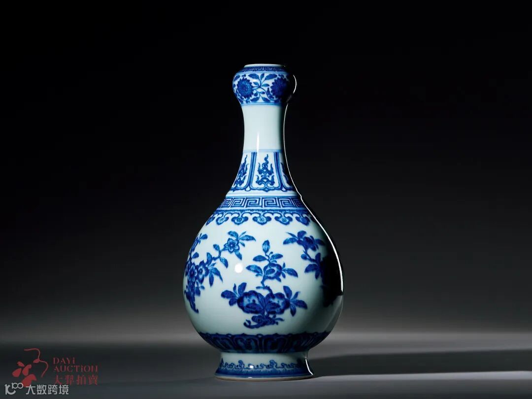 本品直颈,肩部饰凸弦纹三层,球形腹及底内收,下承圈足。通体以青花为饰,自上至下分饰蕉叶纹、回纹、如意云头纹、缠枝莲纹、变形莲瓣纹及卷草纹等。纹饰勾勒精细,层次清晰,青花色泽雅致,浓淡相宜,极具乾隆御窑追求精工细作的创作要求。底部青花书“大清乾隆年制”六字三行篆书款。赏瓶在清代文献中又有“玉堂春瓶”之称,由于其主题纹饰用青花绘成缠枝莲纹,故取谐音“清廉”,常被用于赏赐下臣,故有“赏瓶”之名,暗含谨慎劝诫,为官清廉之意。