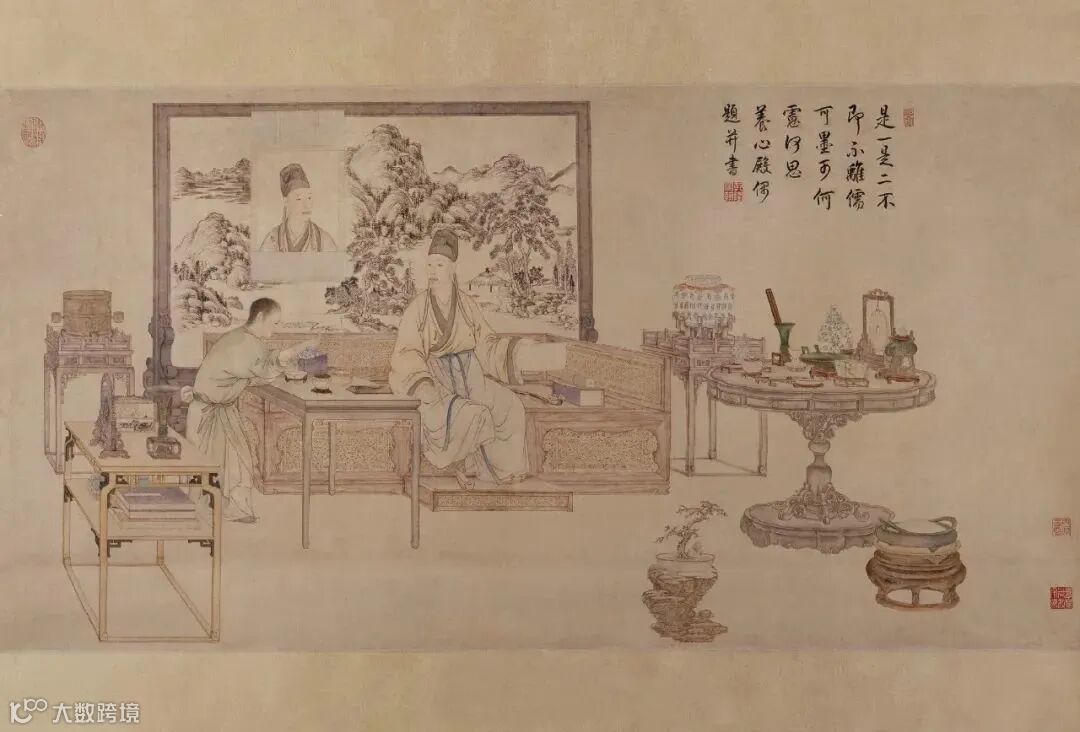 “是一是二,不即不离;儒可墨可,何虑何思”,这幅《是一是二图》写实的记录了二百年前全国乾隆皇帝的文房陈设,画面上来自不同时代,不同种类的古物济济一堂,从商代青铜器到元代的瓷器,映衬出乾隆皇帝儒雅的生活情趣以及顶级的审美。