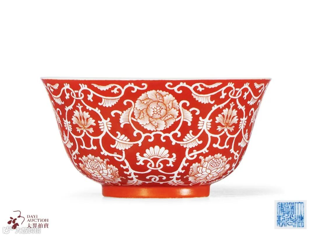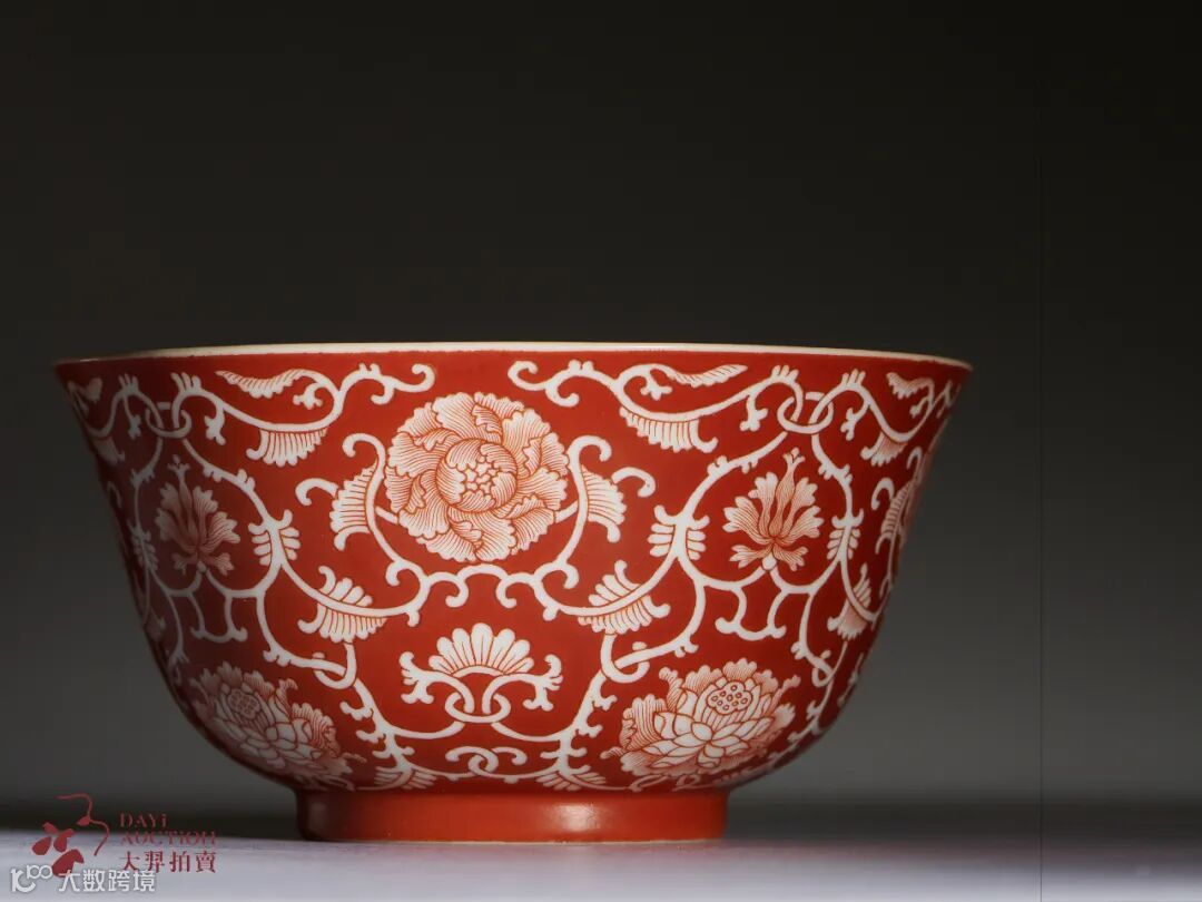 拍品撇口,深腹,圈足。造型端庄,线条起伏优美,内壁光素施白釉,外壁珊瑚红地留白装饰,所绘缠枝花卉布局繁密,花纹留白处以珊瑚红线条勾勒花茎,描绘细致,格调秀雅,新颖别致。