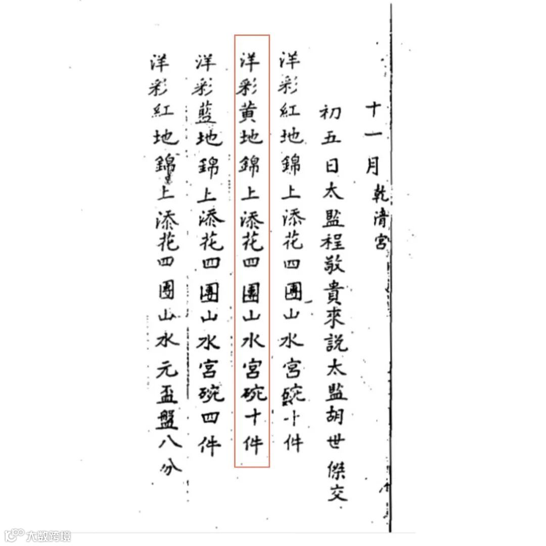 用器物上做装饰,含有吉祥、美满之寓意。道光此式宫碗有黄地和红地二类,均摹造于乾隆朝器皿,依据乾隆朝八年十一月《造办处活计文件·干清宫》记载,此类洋彩器皿原称为“洋彩黄地锦上添花四团山水宫碗”,主要烧造于乾隆六年至八年之间,并被乾隆皇帝秘藏于干清宫内,从不外赐于人。