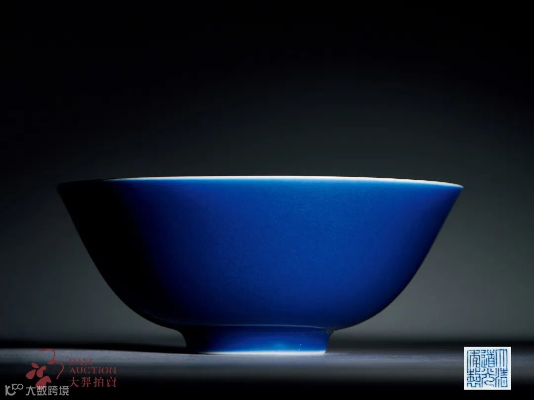 碗型端庄大气,胎体厚重,器形规整,腹部曲线自然、秀美,施釉肥厚,色泽深沉、稳定,色蓝如海,莹润匀净,静穆雅致,赏心悦目。此品种乃清代官窑仿宣窑宝石蓝釉碗式样,内白外蓝,底落“大清道光年制”六字三行篆书款。
