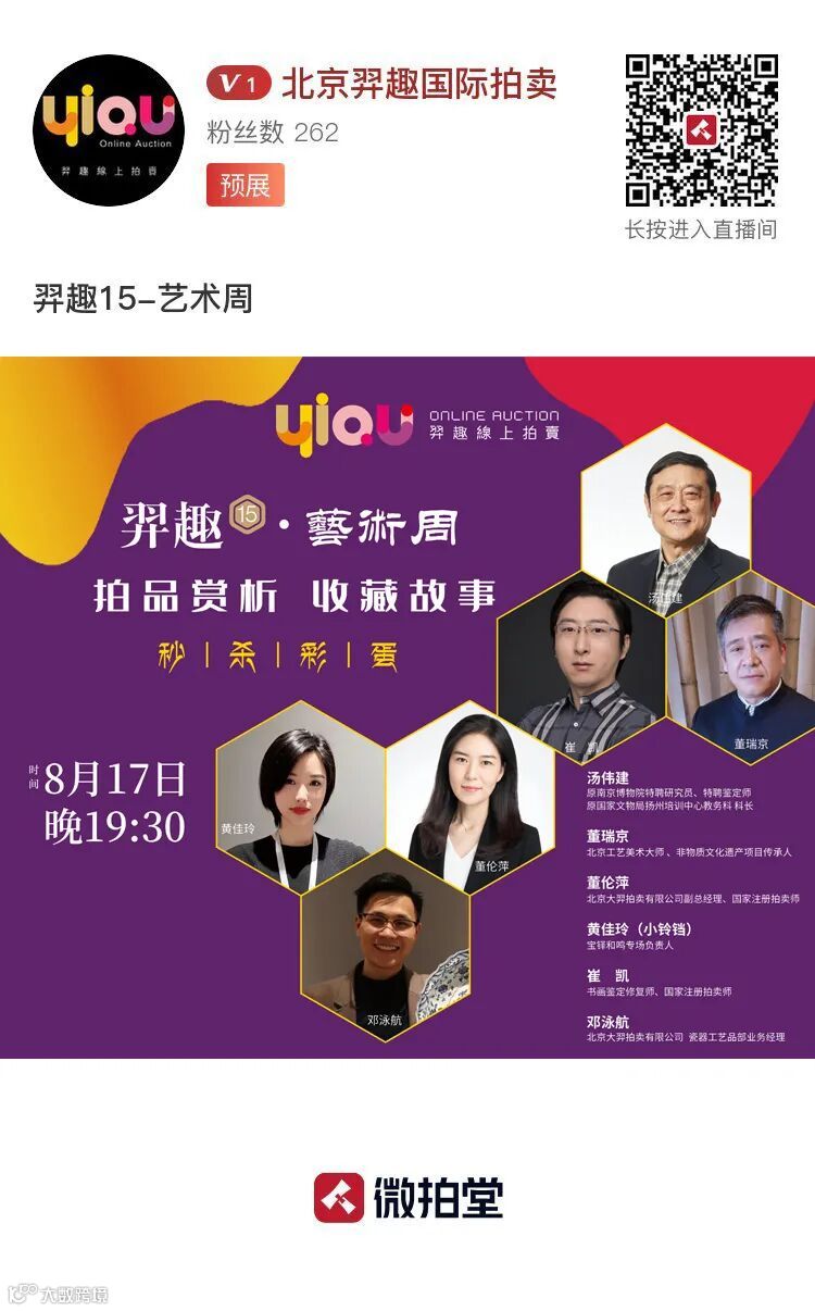 今晚,19点30分,我们将在微拍堂直播间首秀,多位不同领域的专家将为各位藏友带来羿趣15艺术周拍卖会的直播导览。届时还有许多隐藏福利,期待各位多多关注。