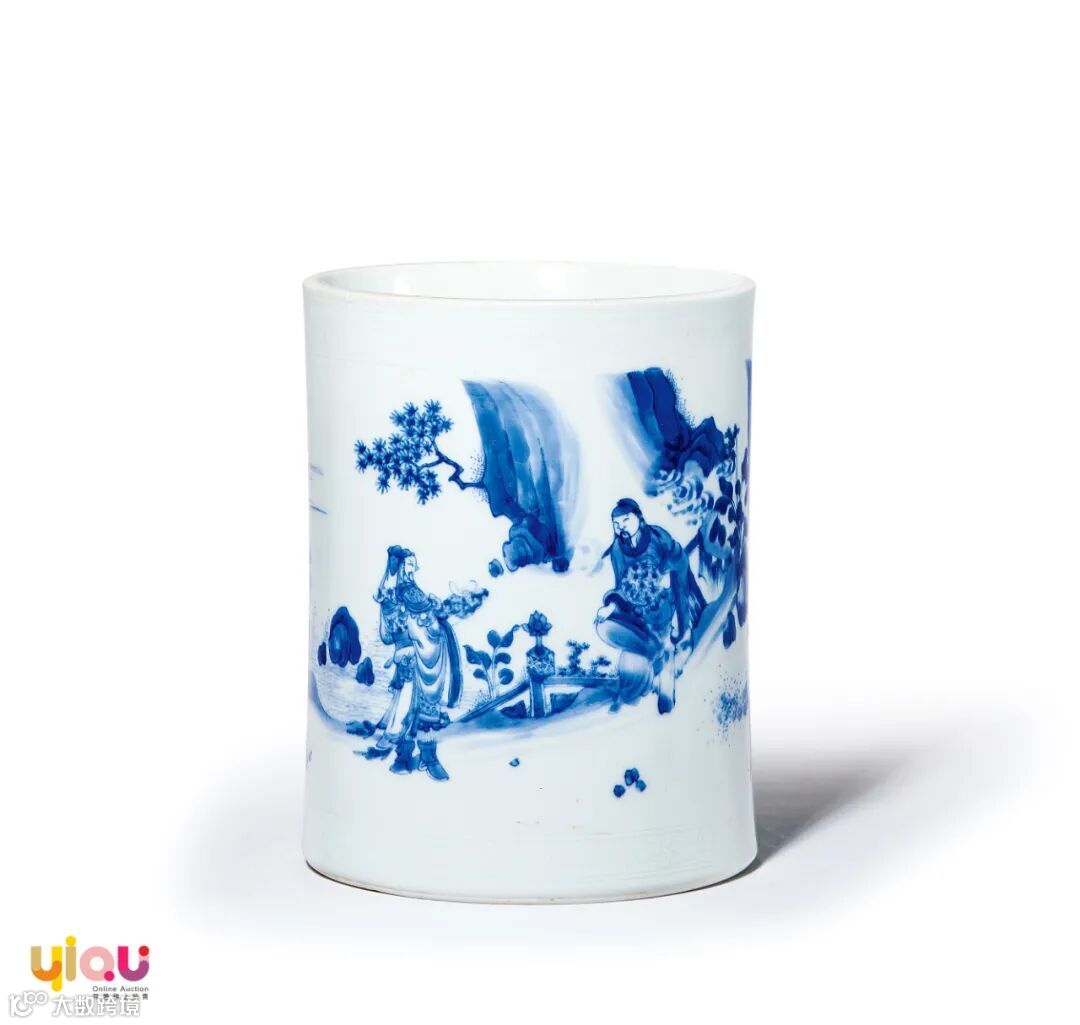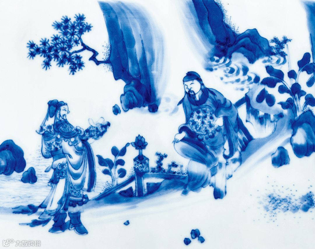笔筒自崇祯朝开始流行,其大量以当时流行的小说版画为范本,将其大量运用到瓷器上。此笔筒即一例,其典故曰:赐马赠袍。其出自四大名著《三国演义》,笔筒近口、底部分别刻有花卉纹,筒身主体乃是曹操倚树而立,关羽手中接过战袍,后有赤兔宝马,辅之山石、云气。纹饰绘制极细,人物线条之勾勒,柳条飘动之感,俊马鬃毛之生动细致,为崇祯青花极精之作。