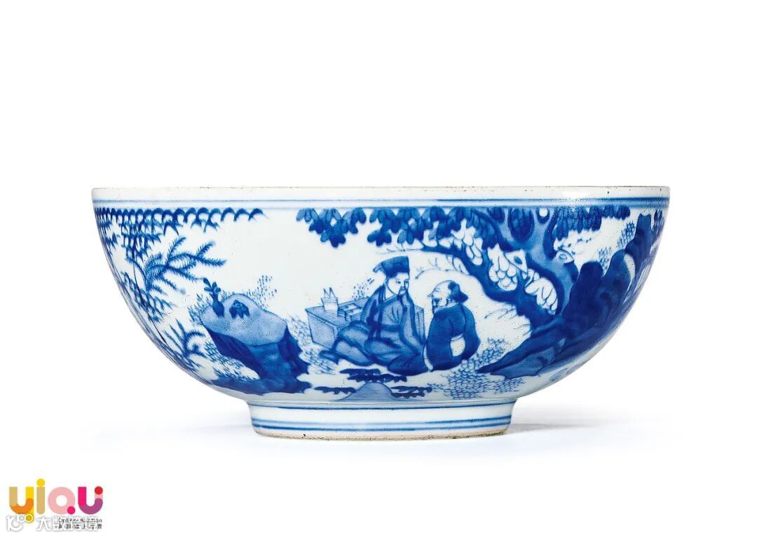 拍品撇口,弧腹,圈足。拍品碗腹通景绘高士,神态自若,仙风道骨,描绘细腻生动。整器器形端庄雅致,釉色均匀光亮,青花发色纯正,纹饰时代特征鲜明,是为崇祯青花器代表之作。