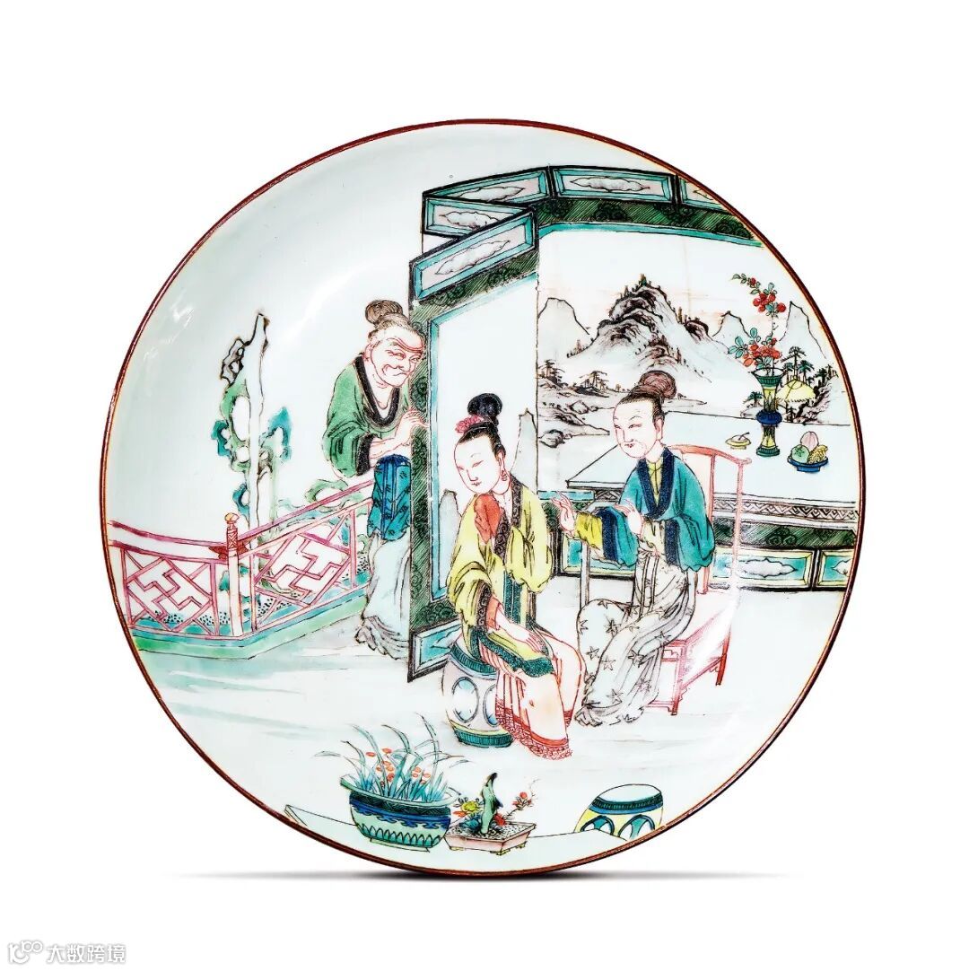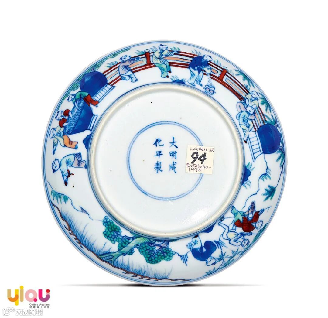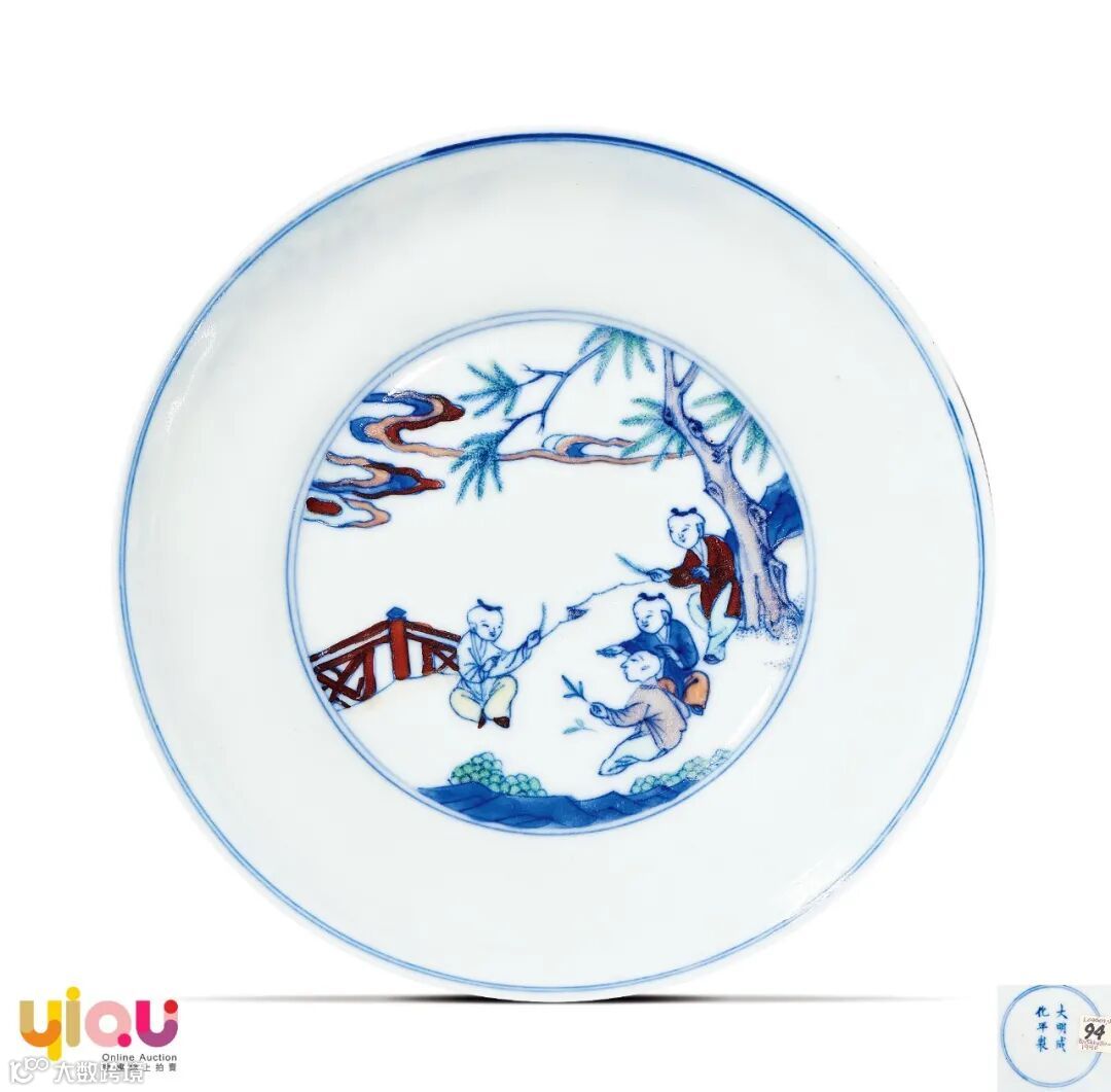拍品敞口,浅弧腹,圈足。器施白釉,盘口内沿和盘心各绘青双圈线,盘心绘斗彩四婴游戏图,盘外壁绘十二婴游戏图,内外相加整是十六子。整体纹饰描摹一丝不苟,施彩严谨,其中每个童子姿态不同,彼此相互呼应,个个都面目姣好,表情天真可爱,气氛祥和。