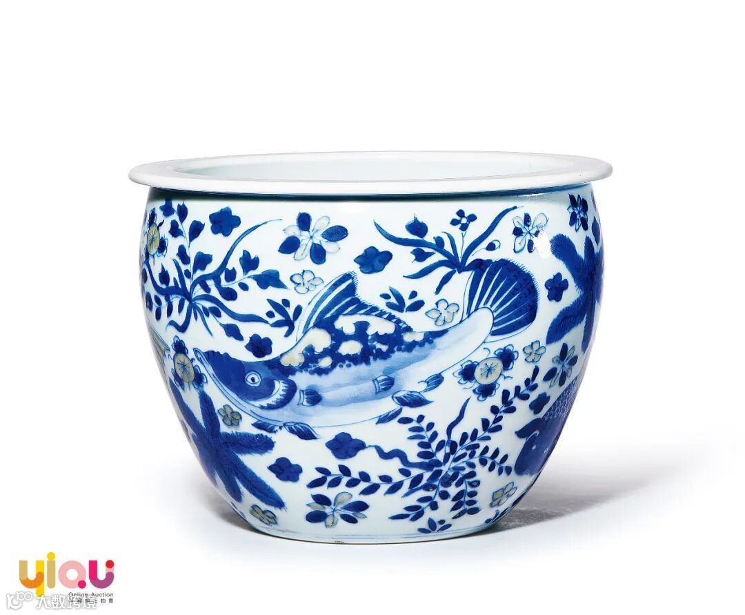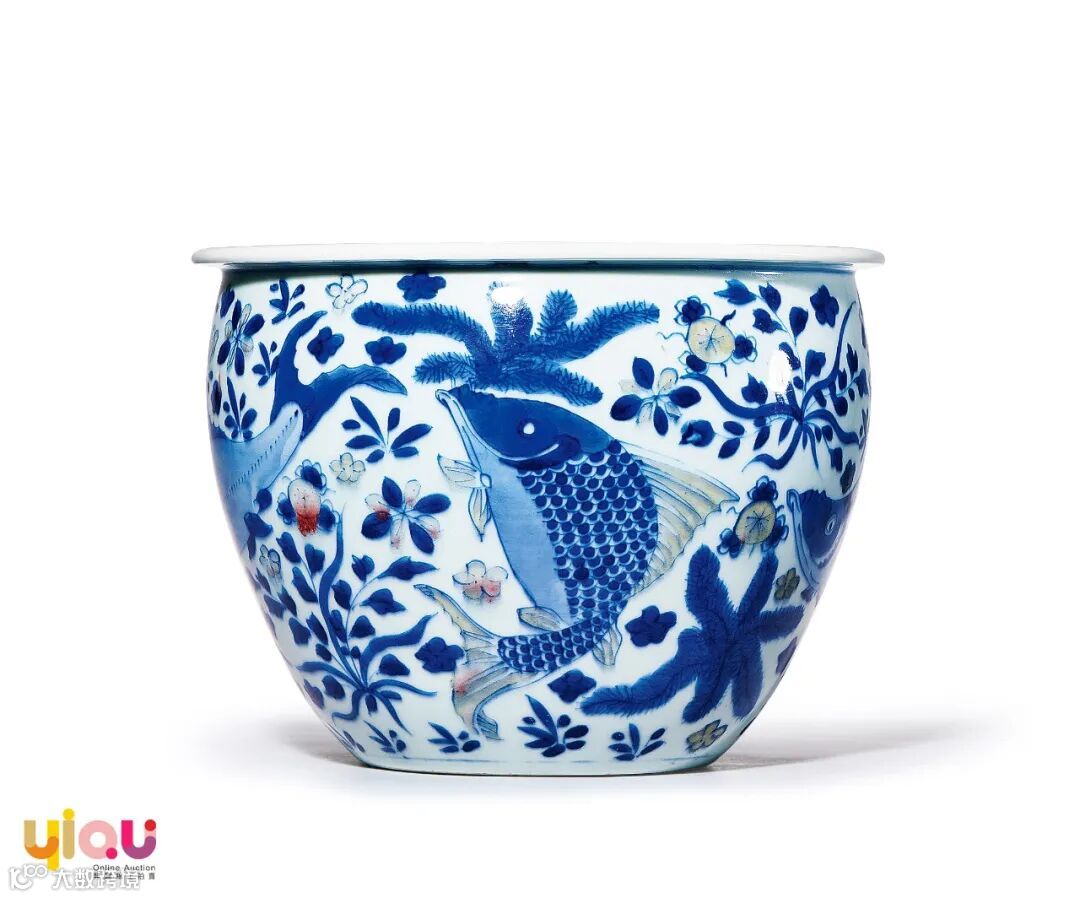 莲池鱼藻纹是瓷器上的传统纹饰,自宋至清,历朝流行不衰。釉里红的製作,明初永乐宣德朝盛行,由于烧造难度太大,明晚期的釉里红隻有在极少数民窑中有所发现,直到清康熙时期才恢复釉里红的生产,而此案缸是正是康熙时期恢复釉里红烧製技术的成功之作,整体造型美观,色彩淡雅纯正,具有极高的欣赏收藏价值。拍品饱满端庄,釉色滋润泛青,器身外壁青花釉里红绘鱼藻纹,游鱼嬉戏,水藻摇曳,所绘游鱼鳃盖鳞片、鳍尾肚白皆富质感。以鱼水之乐为纹饰,表达“年年富贵”美好夙愿。四周辅以水藻纹、朵花纹,水流潺潺,青萍漂浮,运笔古拙有力,恣肆而不失神韵,所绘游鱼之态,灵动精妙,飘动清爽,塑造了一幅水底世界欢快的动态场景。整体绘画笔触细腻,图案精美,勾勒明洁,气魄不凡,青花苍雅,红色深沉,别有韵味,陈于书斋,颇为得宜。