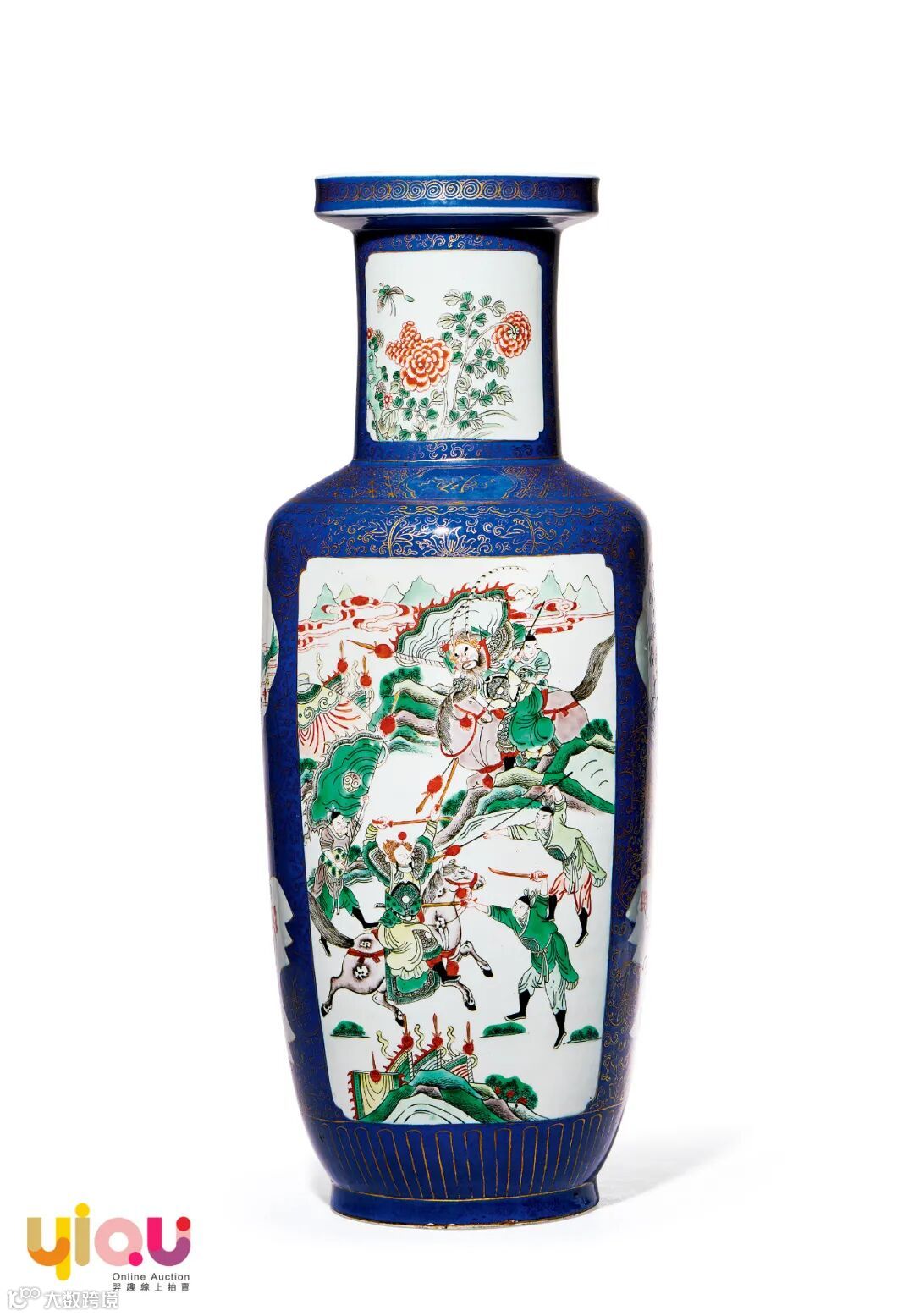 拍品盘口,直颈,丰肩,肩部至底足渐收。器身外部通体施洒蓝釉,瓶腹前后开光内绘五彩刀马人物图,描绘生动传神,观之如有阵阵喊杀声传来,开光外绘描金缠枝花卉纹,整体构成了优美的图画。此瓶金彩和洒蓝釉交相辉映,沉静中见辉煌,颇为难得。