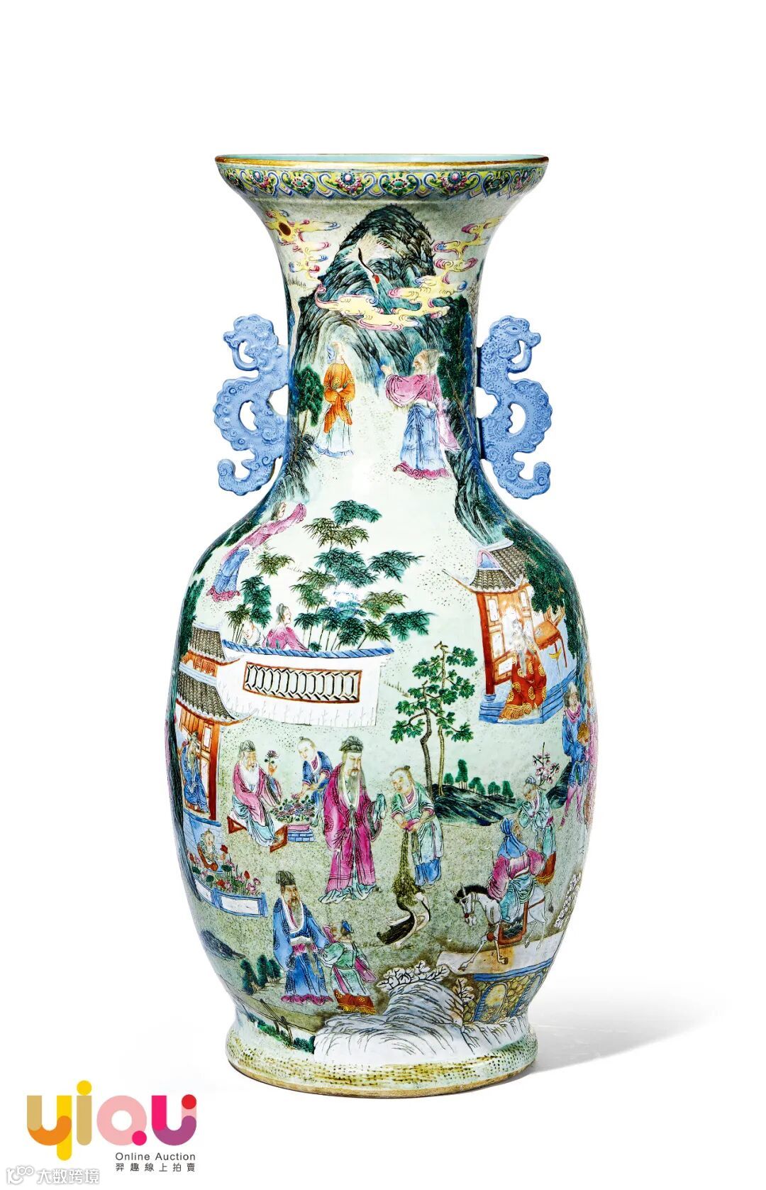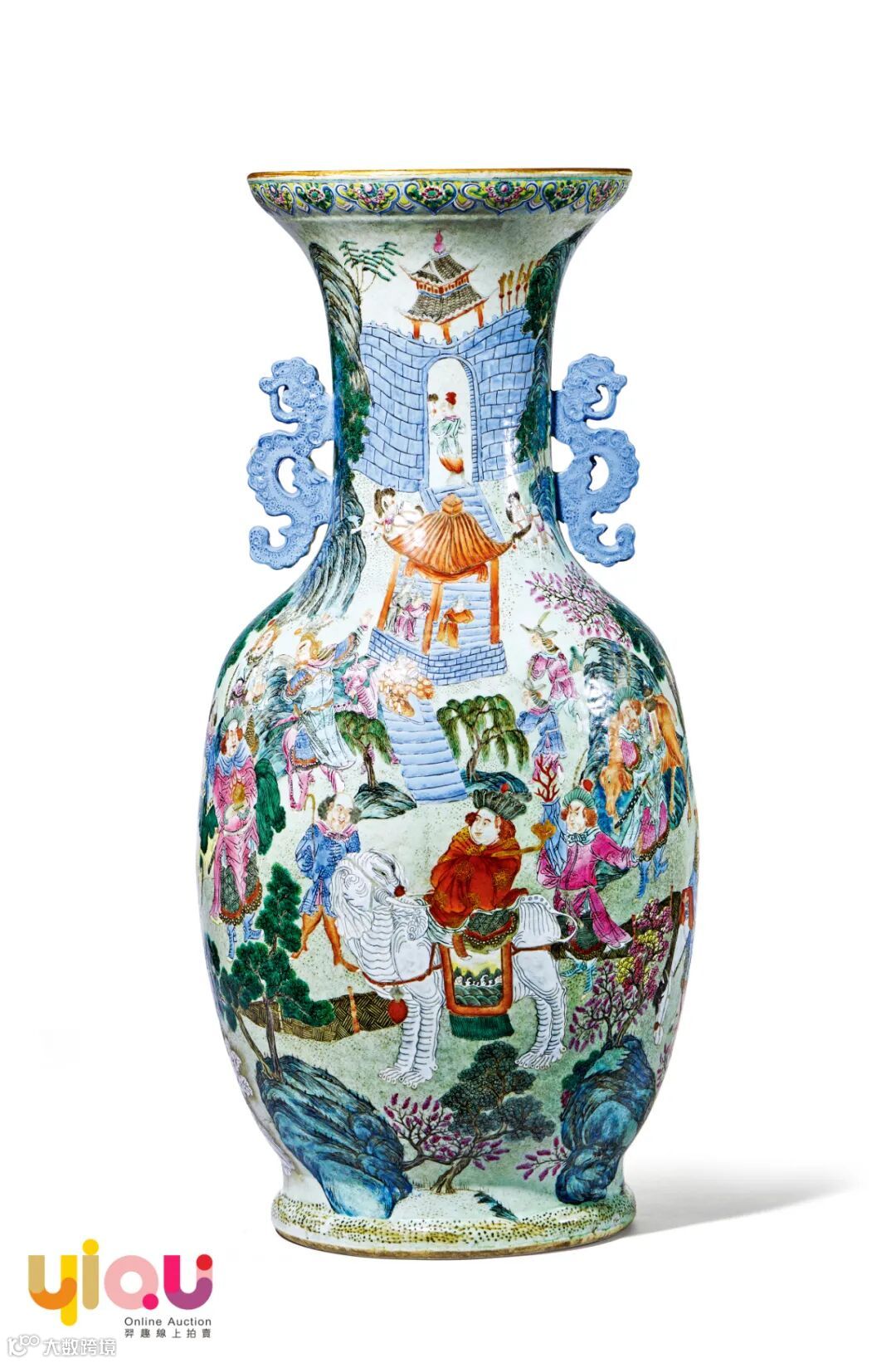 此瓶盘口,束颈,配双螭耳,丰肩,圆弧腹,圈足,造型考究典雅,严谨有度。瓶腹通景绘‘八蛮进宝’图,八路进宝的队伍行于路上,各酋首形态各异,头戴稚鸡翎冠帽,诸随从手持或肩挑贡物,各式珍宝,琳琅满目。所绘人物众多,具异族装扮,挤眉弄眼,憨态可掬,栩栩如生。整体彩绘异常精细,皴法俨然,诸人面貌清晰可辨,神态丰富。彩衣华丽,斑斓夺目,诸彩洗染深浅有度,质感如真。