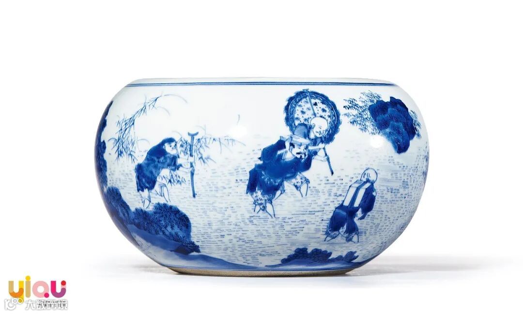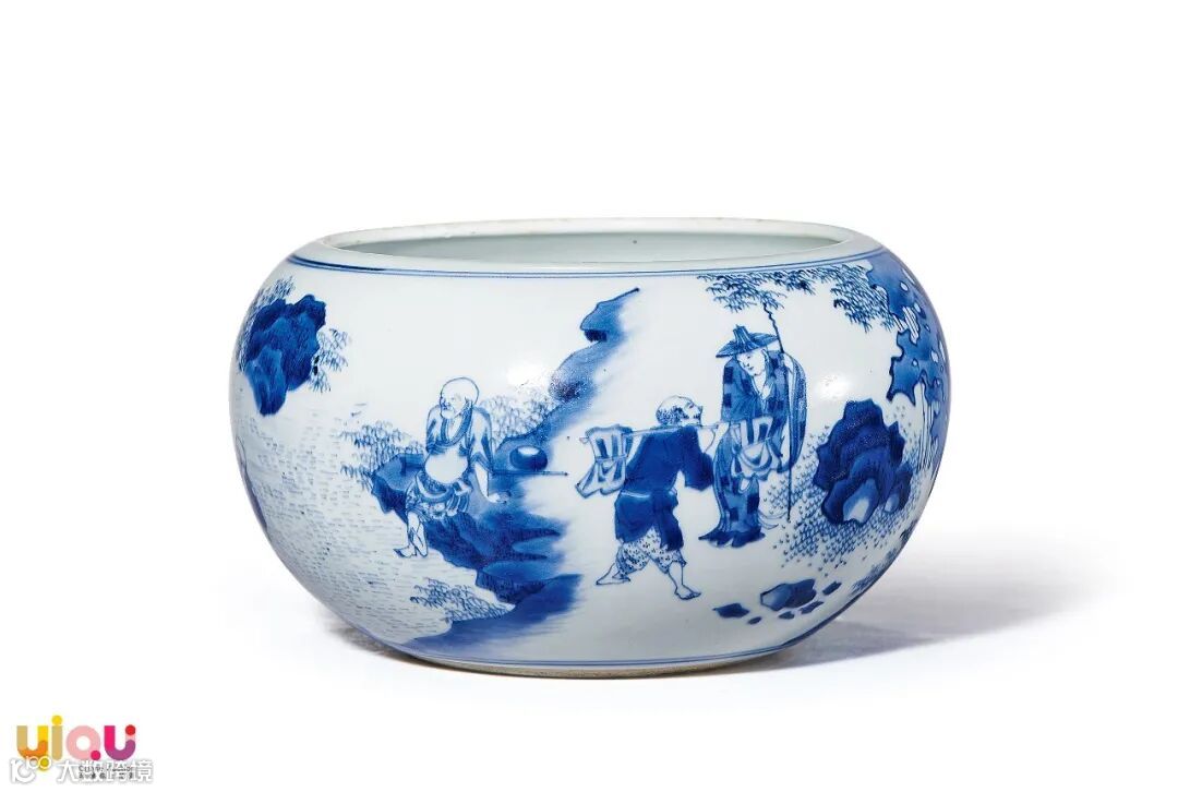 拍品形製规整,敛口鼓腹,胎质细白,白釉莹润。口沿以青花绘弦纹两道,器身外壁通景绘众释负经渡江图,颇具普度众生,登临彼岸之意。悠嬉纷然,人物描绘细致,形象生动传神,间以树木山石点缀,青花钴料发色明快,绘工精致,笔法细腻,时代特征明显。