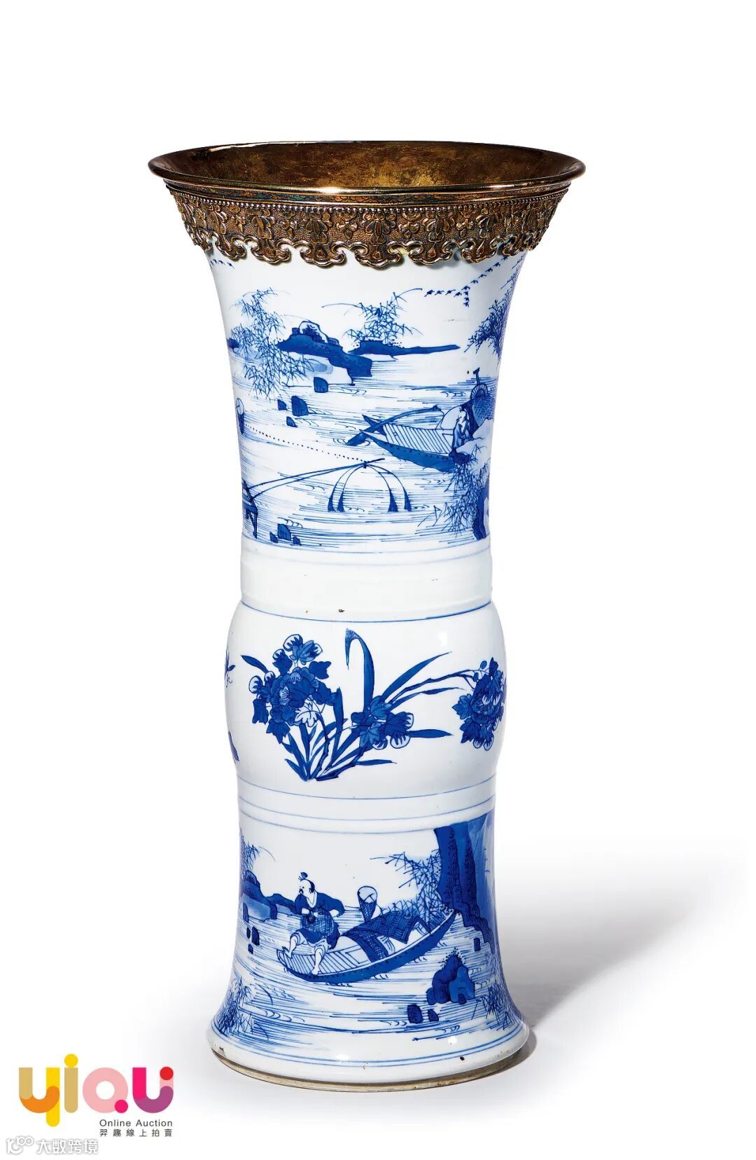 花觚造型取自商周青铜,原为酒具,自宋代开始生产瓷质觚,其功能亦由酒具转变为陈设用器。明末清初之际,瓷质花觚开始大量製作,尤以康熙时最盛。花觚中部突起,以青花绘花卉,上下部均绘山水渔父图,绘画流畅,青花发色艳丽,分水层次清晰。