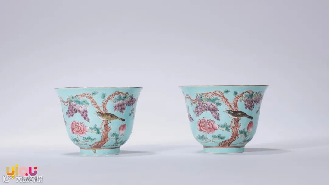 此对拍品撇口,深弧腹,圈足。以松石绿釉为地,其上粉彩绘花鸟图,一株紫葡萄藤,画眉鸣唱,牡丹数枝娇贵粉嫩,浓染淡抹,藤须枝干皆刚柔相间,立体空透,对比强烈,表现出强烈的生命力,器之吉意正在于此。底书“大清宣统年制”六字双行楷书款。