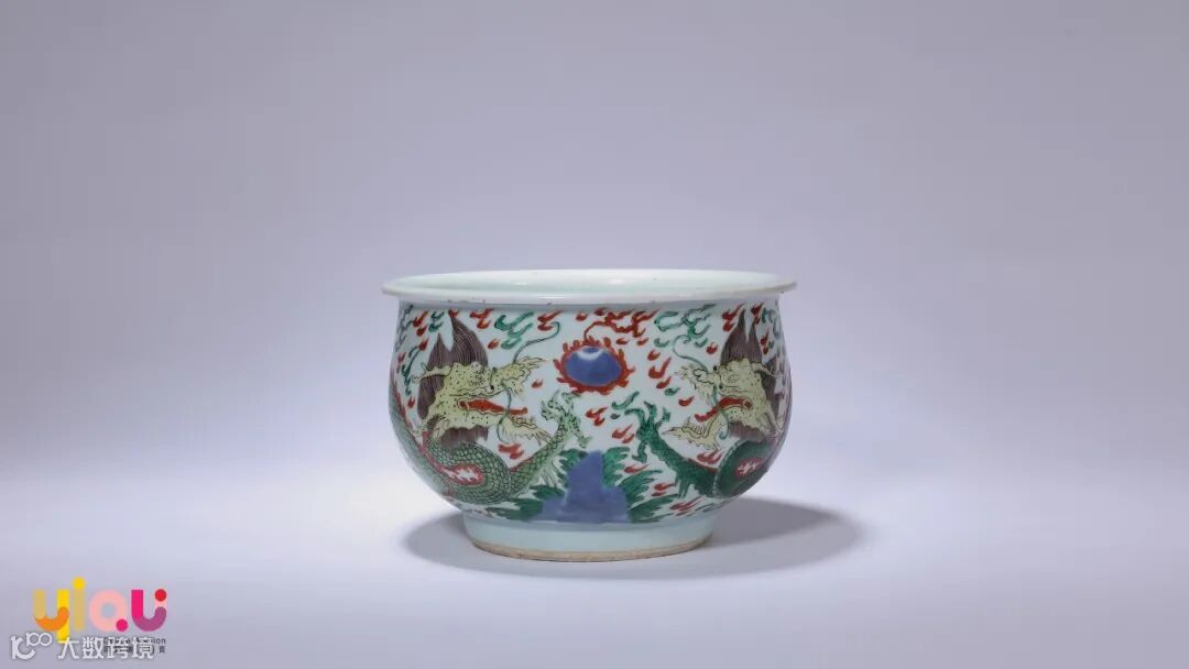 拍品折沿,圆鼓腹,圈足,足端露胎。形制稳重端庄,胎质坚致厚重。通体内外施白釉,釉色白润,外壁通体五彩绘双龙戏珠纹,龙头威武,龙尾细长,大口怒张,龙身雄健,龙爪锋利孔武有力,其间衬以火云纹,形象生动。