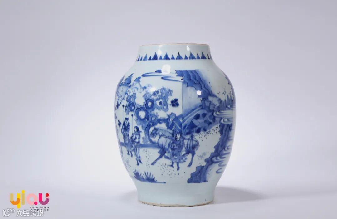 拍品造型秀致,因口、足收束,鼓腹圆润,状如莲子,故名“莲子罐”。外壁以青花为饰,口沿环绘一周蕉叶纹,腹部绘一书生装扮男子偕侍从游于庭院当中,迎面一童子手捧宝瓶,瓶中插有三只长戟,取“平升三级”、“官运亨通”之美意,隙地加饰灵石蕉叶。画面布局有致,青花发色明快,鱼鳞状草地极富时代特征。