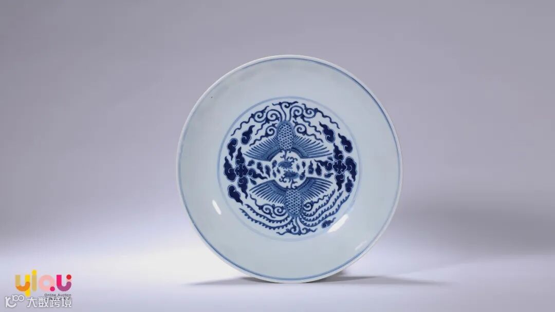 拍品敞口,浅弧腹,圈足,器形规整。釉质细腻温润,器形织巧,白釉泛青,青花色泽青翠,盘心及外壁以青花绘双凤纹饰,附以祥云纹饰,纹饰流畅,构图紧凑,样式优美,此纹饰俗称“对头凤”,是清代官窑瓷器的传统图案之一。器底书“大清光绪年制”六字双行楷书款,排列整齐,字体工整。
