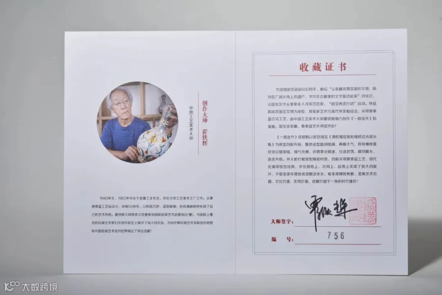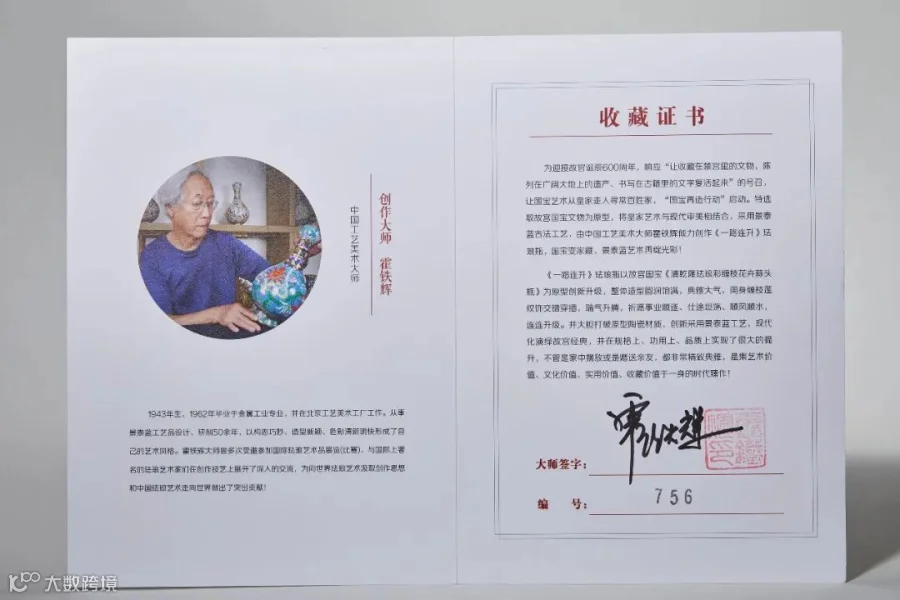 霍铁辉:原名霍铁军。1943年生于北京,1962年毕业于北京市工艺美术学校金属工艺专业,同年入北京市工艺美术工厂从事设计工作。现为中国工艺美术大师、北京市特级工艺美术大师。因参与研制开发成功景泰蓝与玉石等多工艺结合产品,大大提高了景泰蓝艺术品的技术含量和艺术魅力,丰富了景泰蓝的品种,霍铁辉被海内外工艺美术界尊为“珐琅界最具影响力的大师”之一。