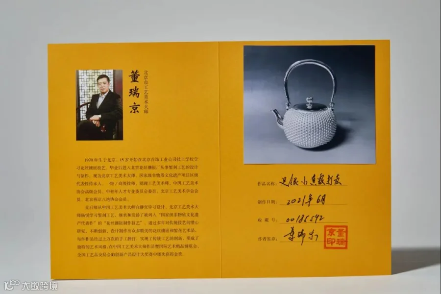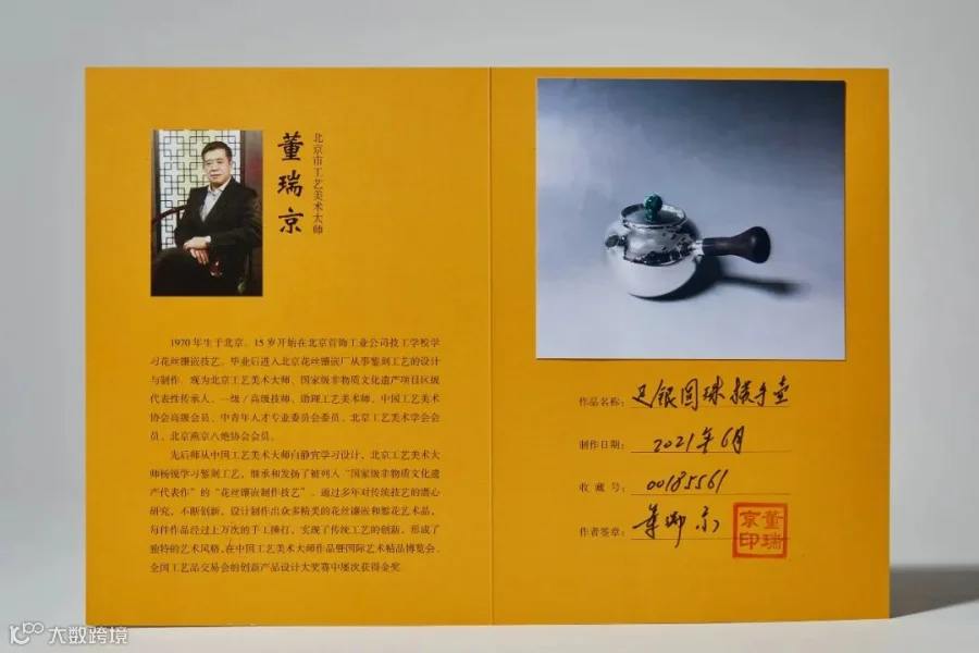 董瑞京是北京燕京八绝之花丝镶嵌枝艺传承。师从中国工艺美术大师白静宜学习设计,师从北京市工艺美术大师杨锐学习錾刻工艺,继承和发扬了被列入“国家级非物质文化遗产代表作”的“花丝镶嵌制作技艺”。通过多年对传统技艺的潜心研究,不断创新,设计制作了众多精美的花丝镶嵌和錾花艺术品,通过将花丝镶嵌工艺与翡翠、白玉、宝石等有机结合,实现了传统工艺的创新,可谓博采众长,独树一帜,形成了独特的艺术风格。