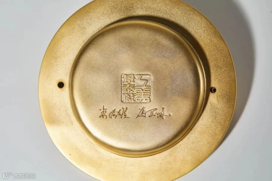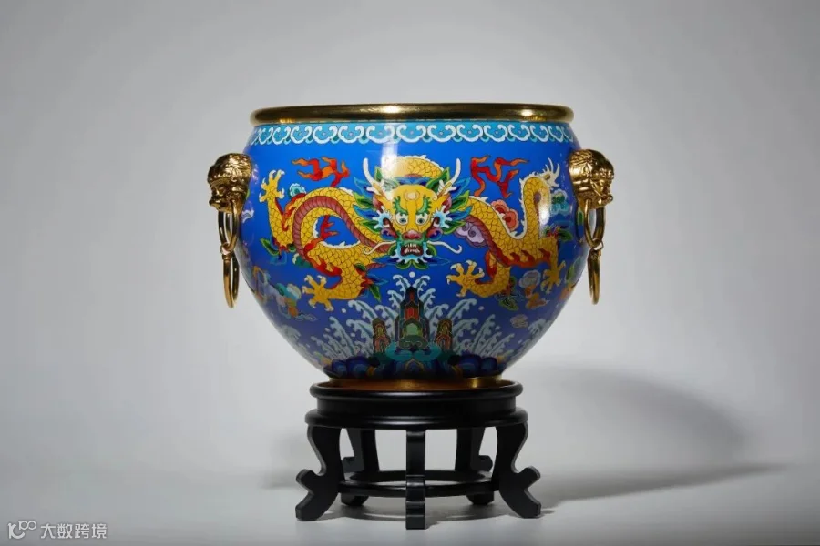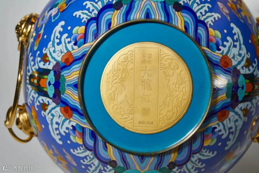 景泰蓝《盛世吉祥•大龙缸》以景泰蓝、金属錾刻两大传统手工绝技,对太和殿门前大铜缸等比例缩小进行艺术再加工。缸的造型敞口、丰肩、鼓腹,寓意胸怀天下,包容万象;两侧镶嵌衔环瑞兽双狮耳,栩栩如生,守家护业;主纹饰提炼大清乾隆皇帝朝服皇袍上的正龙纹搭配如意云头纹、江崖海水纹,寓意太平吉祥,江山永固,基业长青;作品采用戴嘉林大师秘制“海天一色”蓝为底色,提炼中华七色绘制七彩珐琅,成就极致景泰蓝创新色彩,堪称“中国景泰蓝色彩第一器”!