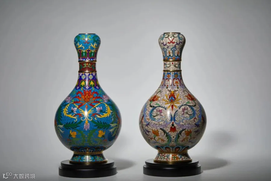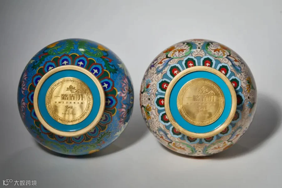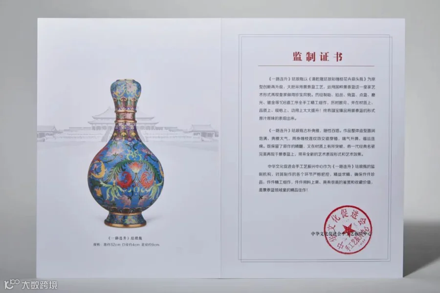 《一路连升》以故宫国宝《清乾隆珐琅彩缠枝花卉蒜头瓶》为原型创新升级,整体造型圆润饱满,典雅大气,周身缠枝莲纹饰交错穿插,瑞气升腾,大胆打破原型瓷器材质,创新采用景泰蓝形式,并分别以“奶油黄”、“宝石蓝”为主色调,创新打造出两种经典款式。传承皇家工艺,现代化演绎故宫经典。
