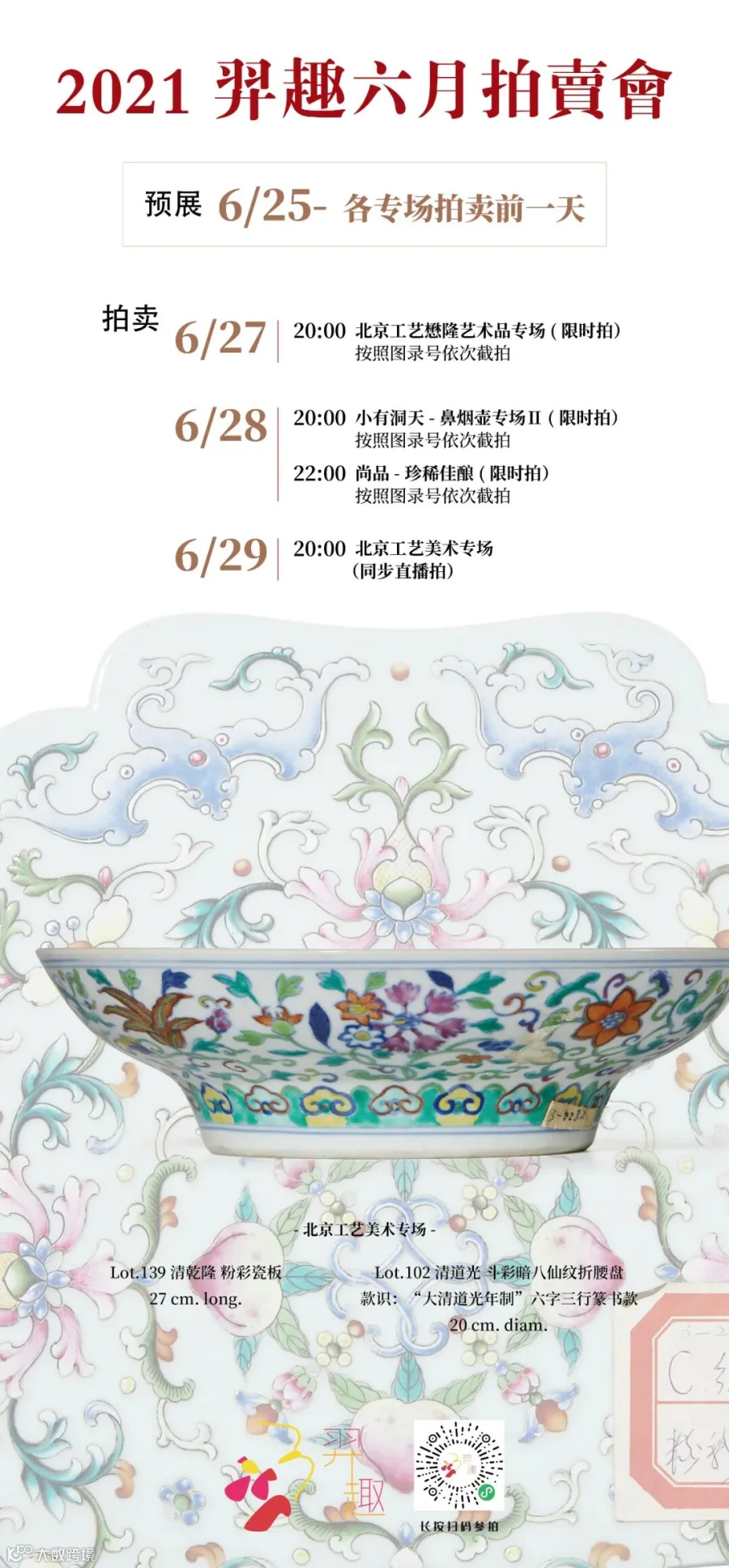 2021羿趣六月拍卖会将推出“北京工艺美术”专场,将为各位呈现多件由中国工艺美术大师、北京市工艺美术大师、亚太地区手工艺大师及非物质文化遗产传承人等人的作品。本专场旨在为各位展现中国传统非遗技艺的巧妙绝伦。在弘扬传承中国文化的大时代下,中国传统工艺得到了广大收藏爱好者的欢迎。景泰蓝庄重典雅的宫廷艺术散发出新时代的光芒,雕漆倾注匠心、精工细琢展现出博大的文化艺术,花丝镶嵌、京绣、宫毯、金漆镶嵌,以传统精湛的优良的制作技艺展现出博大精深的中国艺术文化智慧。