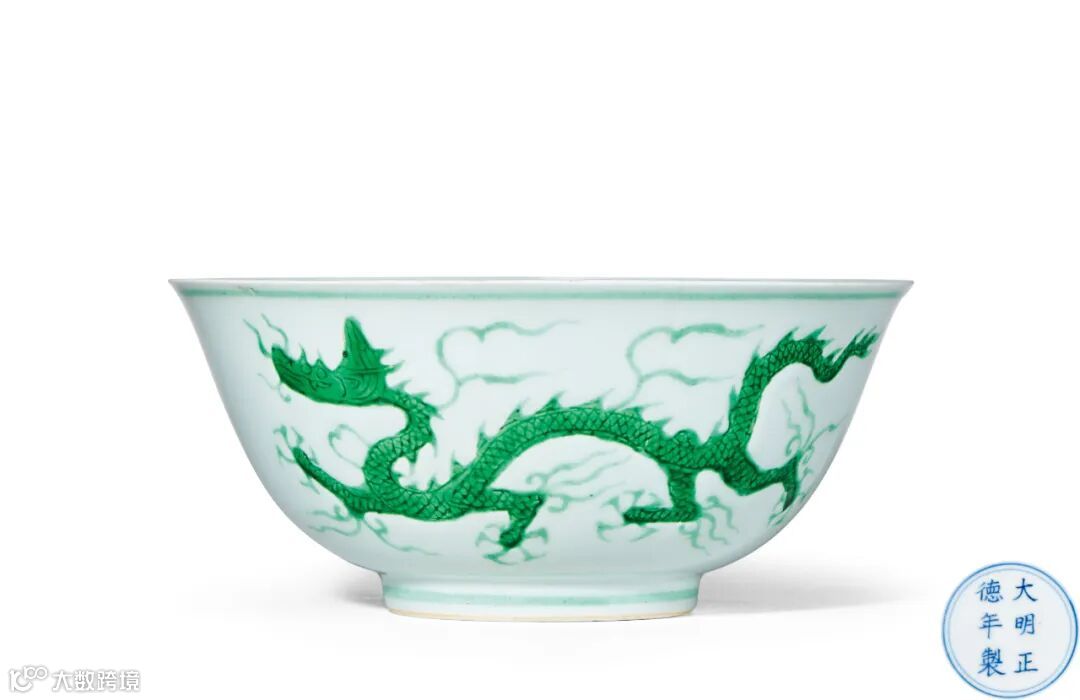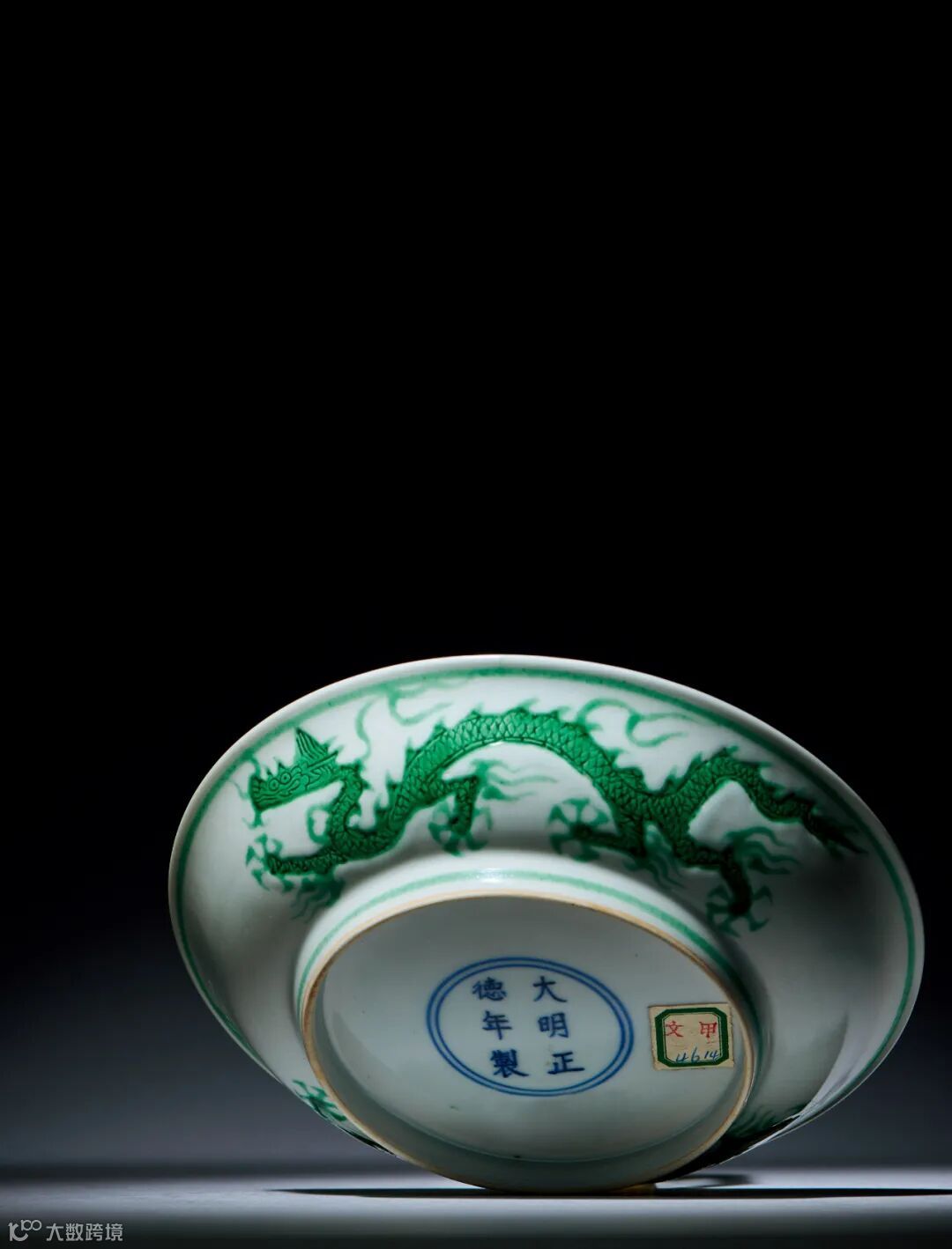 此种绿云龙纹样,亦有碗之造型,始自成化,正德最兴,嘉靖之后则不复见矣。清初康熙年间曾略有仿效,但品格与质量均不可与正德时期相提并论。康熙之后,又在此基础上创烧了新样式的白地绿龙盘,并一直延烧至宣统,但所绘龙纹不及正德之万一。本品承袭成化官窑制式,整器釉面莹闰,胎体细腻,刻画生动,动感极强,为明正德时期佳作。