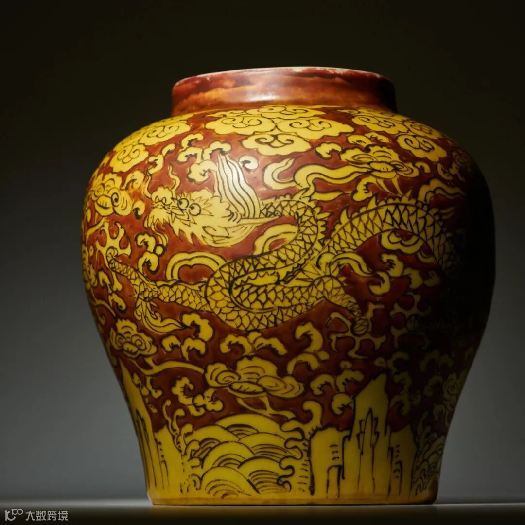 右图:明嘉靖 红地黄彩云龙纹罐(美国亚洲艺术博物馆藏)