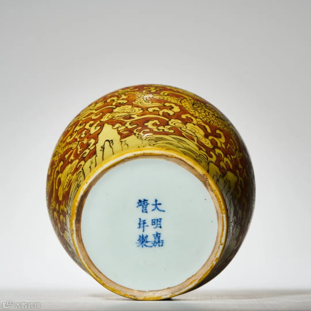 本品造型敦实而秀润,全器以矾红彩为色地,以黄彩绘画纹饰。器身肩部绘如意云一周,腹部主题纹饰为双龙驾腾于寿山福海之上。花饰繁缛丰富,笔意潇洒恣肆,云龙古拙可爱,虽无永乐、宣德盛世威武刚猛之气,却独具诙诡古趣,为嘉靖时期特有之风格。底部所见胎骨厚重坚致,圈足内均施亮青釉,厚润莹美,中心青花楷书『大明嘉靖年製』六字双行楷书款,色泽浓妍泛紫,笔力遒劲,深透胎骨。