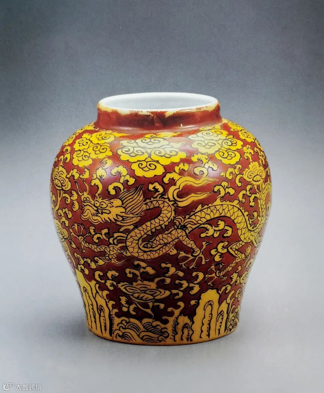 左图:明嘉靖 红地黄彩云龙纹罐(北京故宫博物院藏)