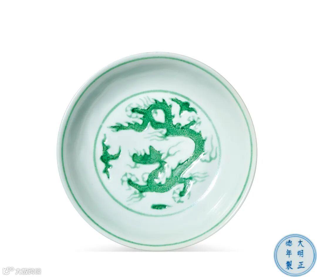 盘为敞口,弧壁,浅腹,圈足。内外壁均施白釉,釉面莹润光亮。外壁釉下刻画海水纹,釉上以绿彩描绘两条五爪云龙,祥龙身躯蜿蜒,极富动感;内底、口沿及足墙处均绘饰绿彩弦线,盘心施绿彩绘一侧面团龙,龙纹轮廓清晰,周饰祥云。外底青花双圈内书『大明正德年製』六字双行楷书款,字体规整雅致。整器胎体细腻,釉质润泽,线条勾画自然流畅,纹饰生动传神,颇具帝王之气。