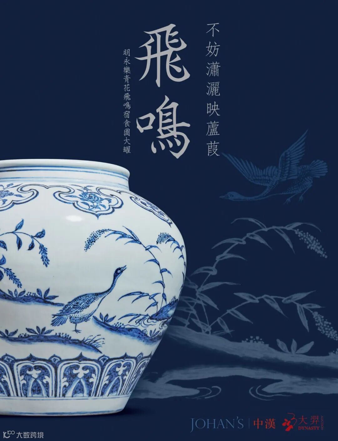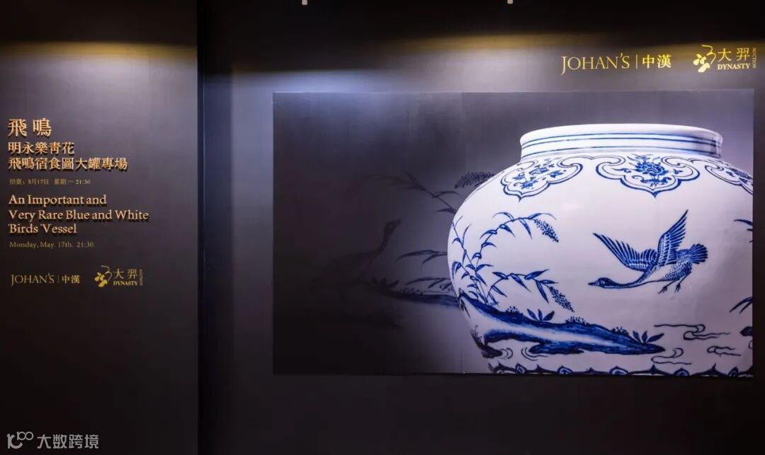在刚刚结束的北京大羿2021年春季艺术品拍卖会中,我们正是带着这样的使命感。在每一件拍品从征集到上拍的过程中,我们做了无数的努力,大量的学术工作,呈现了丰富、详实的研究资料;进行了严格的品相审查;举办了深圳、厦门、烟台三地巡展。这次和中汉拍卖联合呈现的“飞鸣:明永乐青花飞鸣宿食图大罐”专场的筹备历时数月,作为两家同样深耕于瓷器工艺品领域的拍卖公司,我们全力以赴,为其呈现了精彩的直播讲解、单行本的制作、运用特效技术的绝美视频、以及一篇又一篇的媒体报道,只为让更多人看到绝品永乐青花的孤世之美。在此稍作整理回顾,让我们再次360度全方位立体地去感受它吧。
