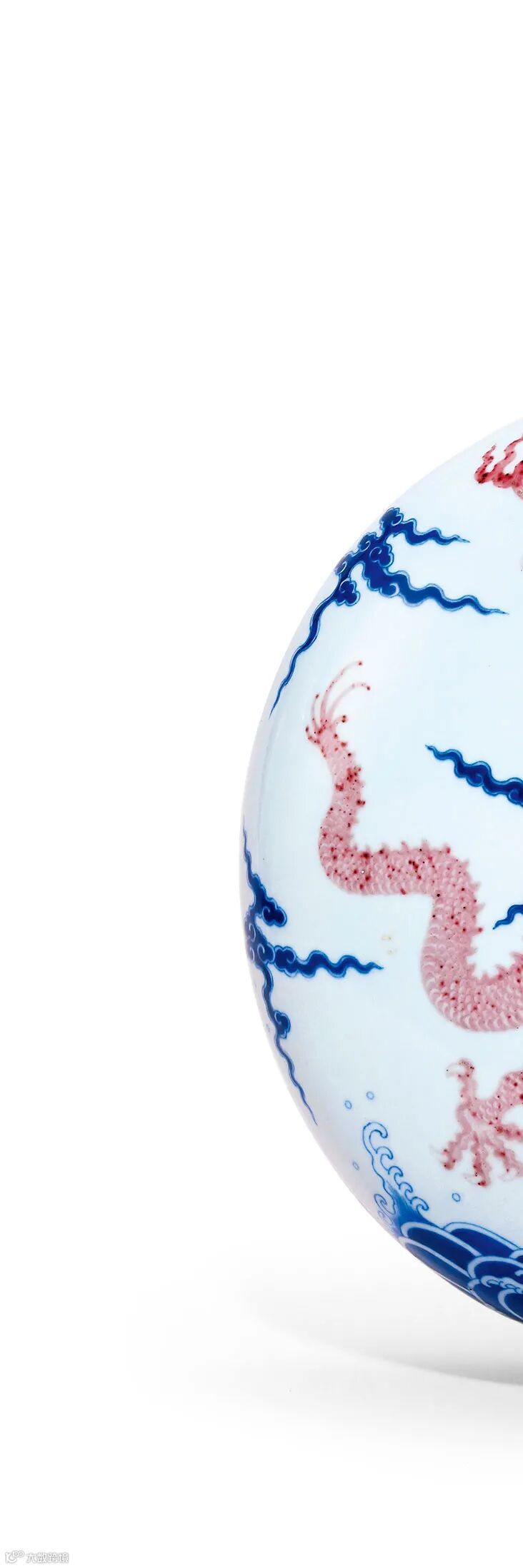 本品亦然,龙纹以釉里红勾勒纹饰后加点涂法而成,不使用平涂技法。故本品龙纹出色鲜妍清晰,不可不归功于乾隆皇帝的勤勉关注。