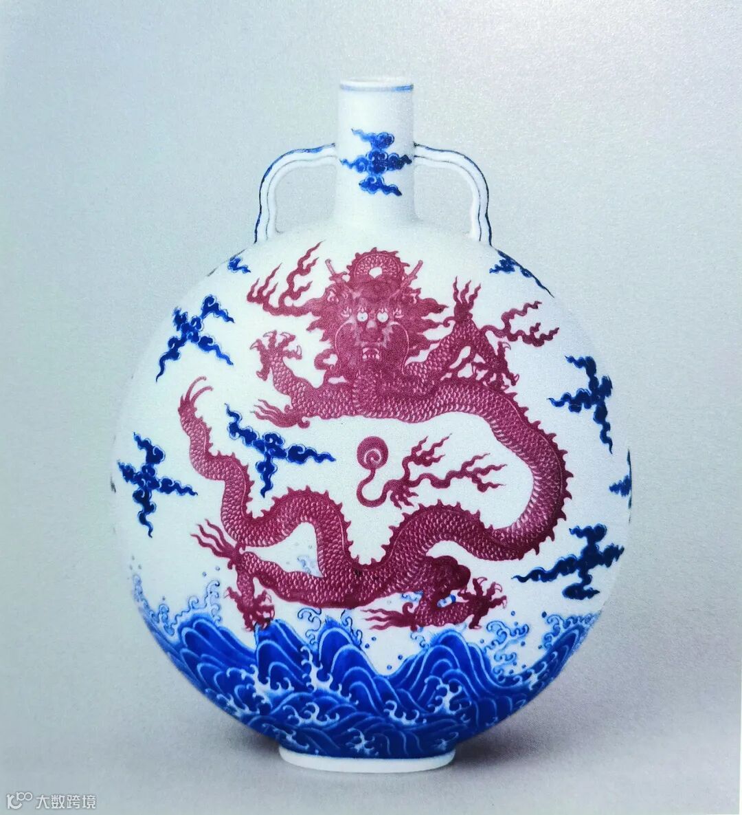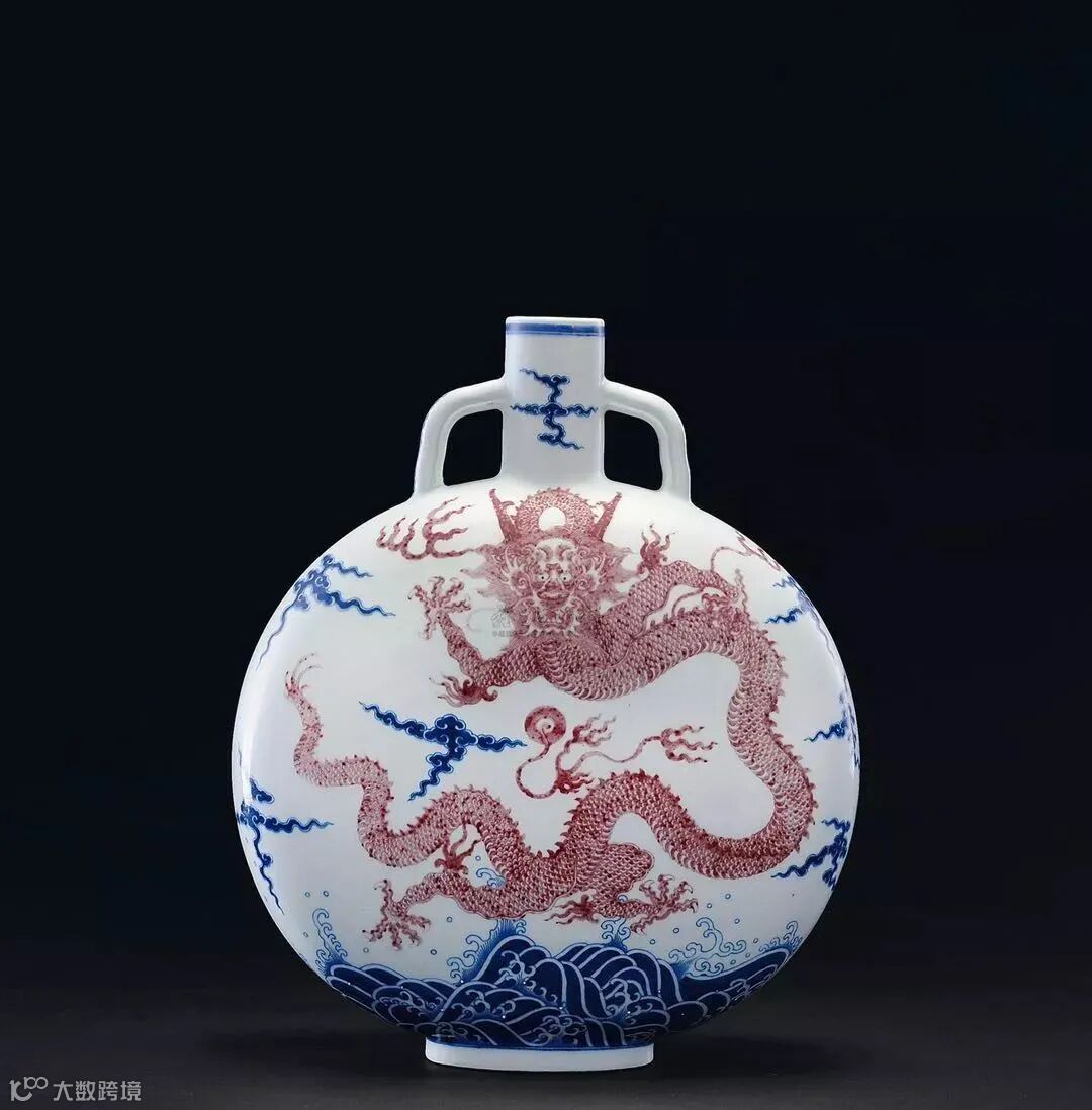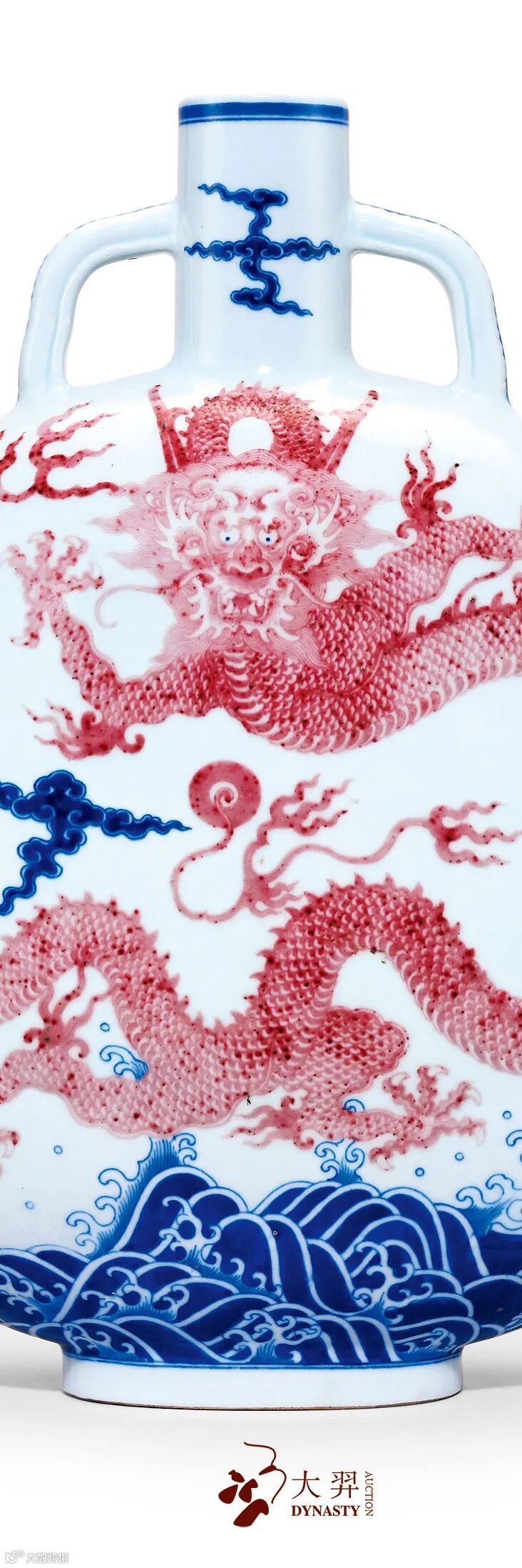 本品造型优雅隽秀,直口短颈,左右附饰二耳,玲珑别致,扁圆腹,椭圆形圈足。釉质温润莹白,器身前后均绘饰立龙海水纹,以青花绘祥云与浪涛,层次清晰,尤见浪涛动感强烈,以釉里红绘画正面立龙,巧缀青花点睛,其雄硕遒劲,威仪横贯,气夺千里。其图案雄伟,气势恢弘,彷佛宣告海内之地,帝德无远弗届。此瓶尺寸硕大,绘饰宏壮,为清朝瓷匠精工巧艺之佐证,炫耀盛世辉煌。此瓶将乾隆帝的思古之情,华丽雄浑之品味,纳于一身,游龙踏浪,跃然瓷上。龙纹乃中国瓷器及工艺品最重要之纹饰,象征帝王及皇权,此瓶钴蓝发色浓艳,所施釉里红一色妍丽,纹饰强而有力,所施釉里红一色妍丽,发色于市场流通中为极上品,含蓄之美宛如佳人初醉,与青花明快鲜亮之色,相互辉映,映衬出乾隆时期国力雄厚、万国来朝的盛世风采。