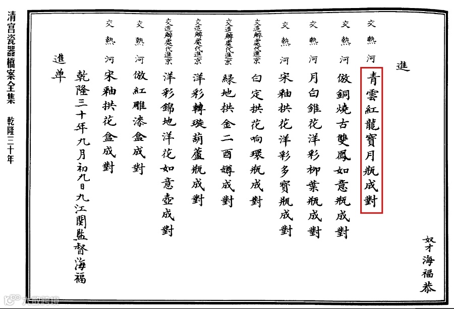 据《唐英奏折六十二号》记载:“窃奴才在京时,(乾隆四年)十月二十五日,太监胡世杰交出釉里红马挂瓶一件,画样一张,传旨看明瓷瓶釉色,照纸样花纹烧造几件送来,务要花纹清真。并将古瓷样式好者拣选几种,亦烧造釉里红颜色,俱写乾隆款送来呈览。钦嘱奴才看明釉色,只领纸样,恭捧到关,即遵旨拣选古瓷、画样内好者数种,一并交窑厂协造葆广等敬谨烧造,并谕俱造釉里红颜色,务要花纹清真,釉水肥润,颜色鲜明。俟造得时奴才拣选送京恭呈御览。”