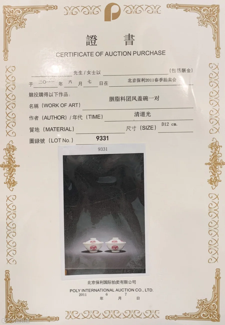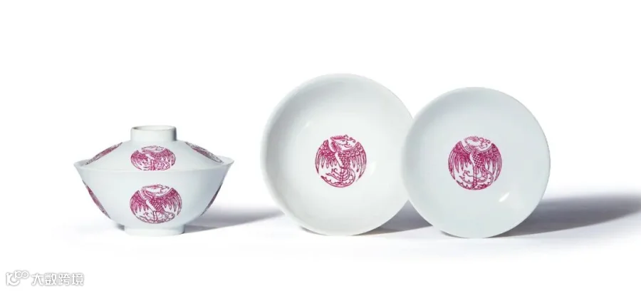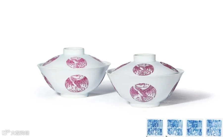 此对拍品撇口,深弧腹,圈足,带盖,盖合于口内,吻合严密。碗形周正,线条柔美,造型精巧。碗内外施白釉,胎质细洁致密,釉质肥润莹白,外壁绘五组等距胭脂红团凤纹。凤身以圆形为界,扭首低鸣,双翅飞舞,凤尾飘摇,翻转翱翔,鸣于九天,高贵华丽,亦飞扬灵动。底落“大清道光年制”六字三行篆书款。整器纹饰绘画精细流畅,用笔纤细柔雅,构图简单舒展,胭脂红发色艳丽,与白地相映,愈显明艳非凡,且成对保存,实乃道光官窑得意之作。
