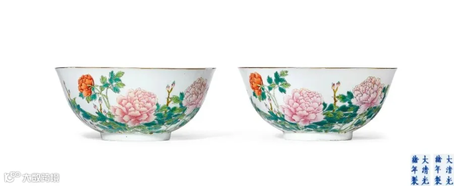 粉彩牡丹花卉纹碗一对 款识:“大清光绪年製”六字双行楷书款 直径:21 cm. 来源:国营文物商店旧藏